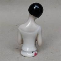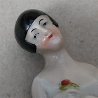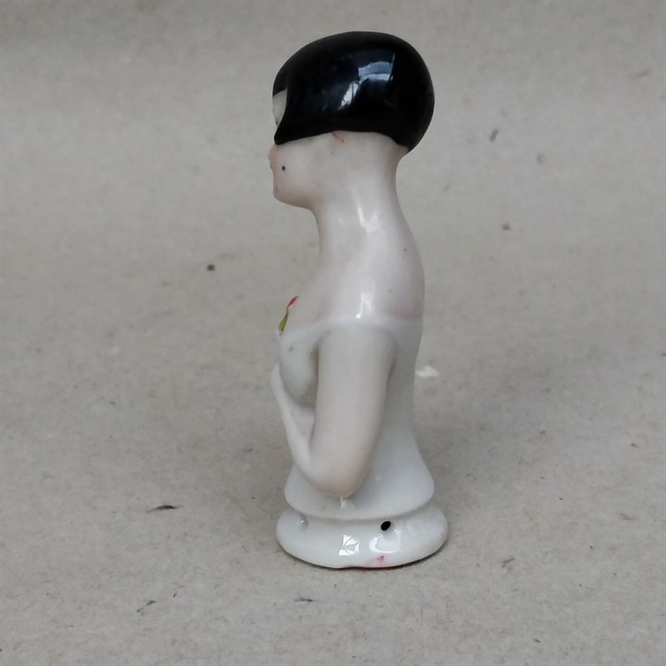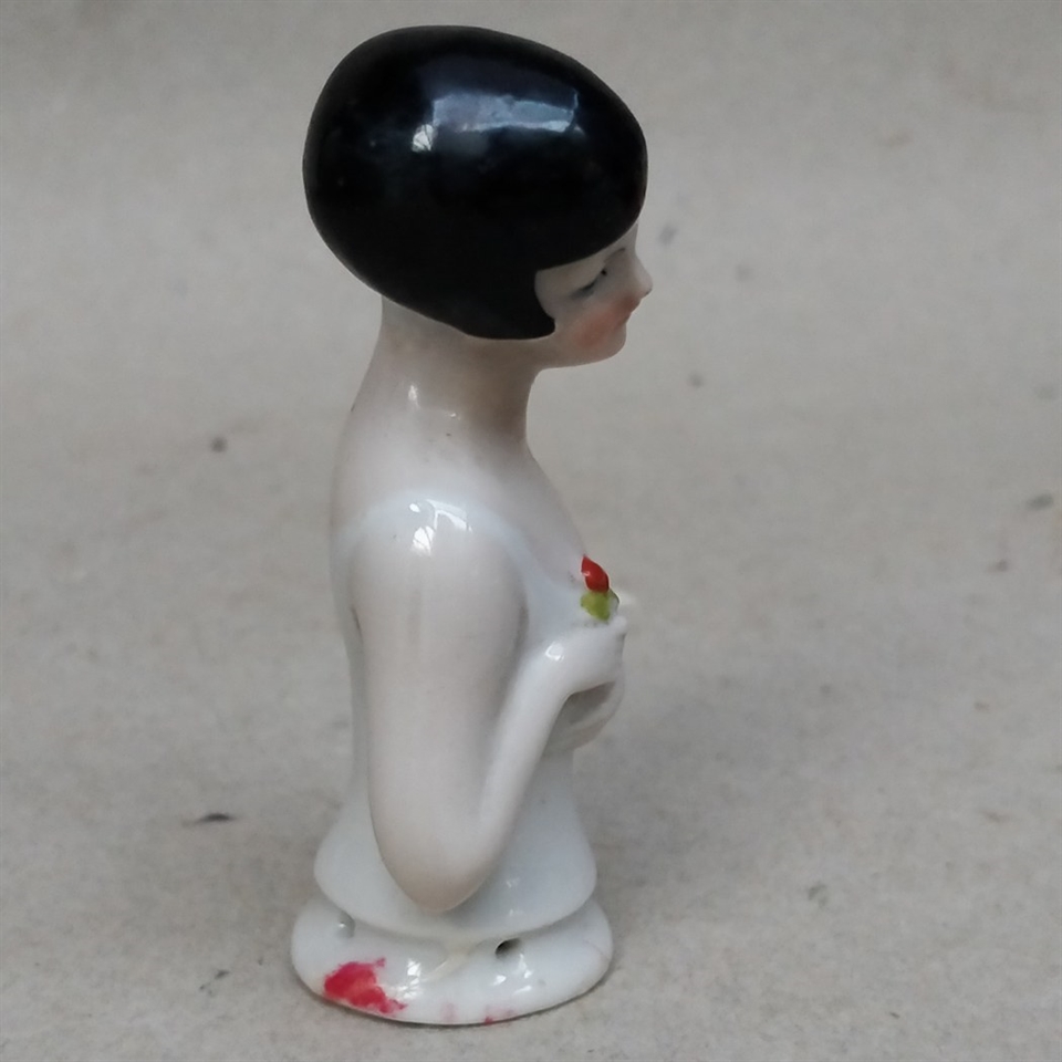 Denne delikate figur er 8 cm. høj og fremstiller en halv kvinde med karakteristisk sort pagehår og en smuk blomst i hånden.