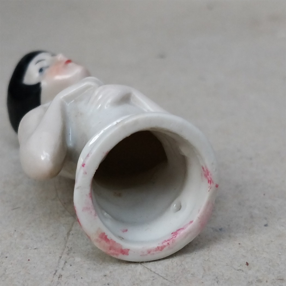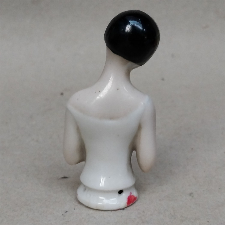 Opdag charmen ved vintage med denne unikke porcelænsfigur, "Halvdame med sort pagehår".