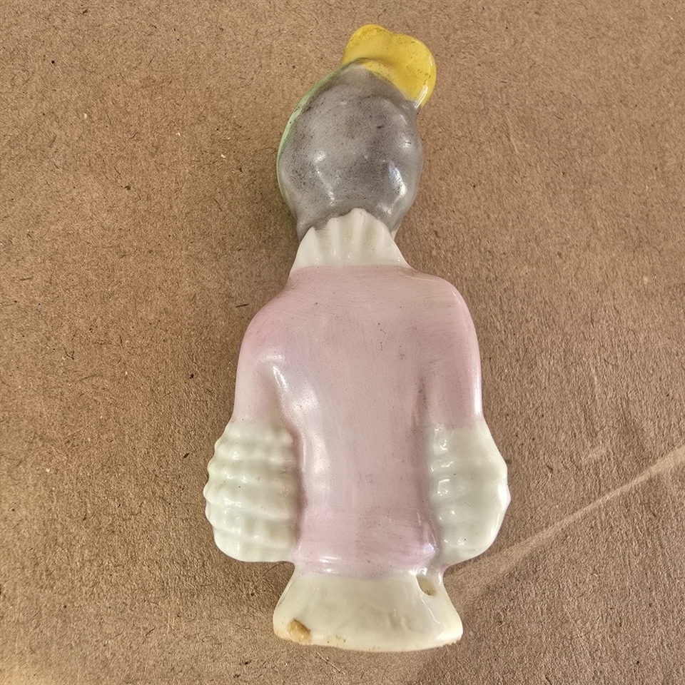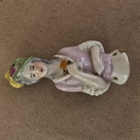 Denne halvdukke, fremstillet af fint porcelæn, fremstår med en sart rosa bluse og en karakteristisk grøn hat placeret på skrå, hvilket tilfører et strejf af nostalgi og elegance.