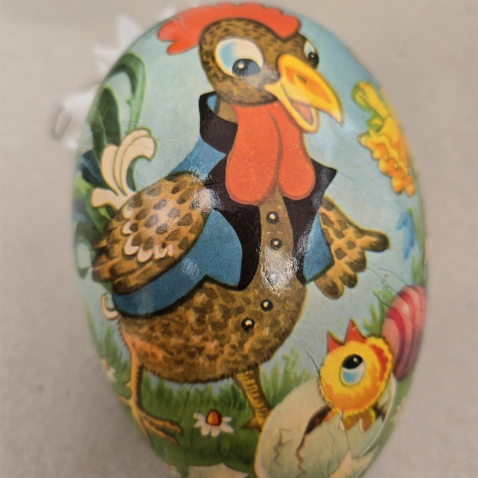 Opdag charmen og nostalgi med vores 'Hane pyntet gammelt pap påskeæg', et unikt stykke påskepynt, der bringer en vintage følelse ind i dit hjem denne påske. Dette smukt dekorerede papir-påskeæg er en sand visuel glæde, som måler imponerende 17,5 cm. i højden.