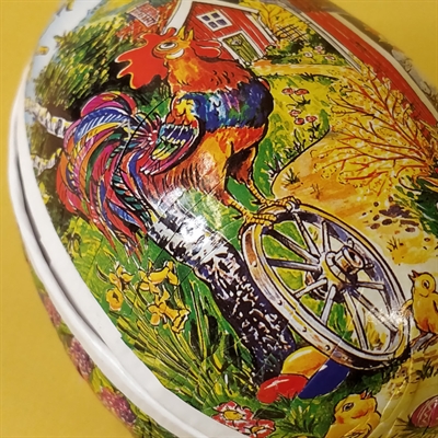 Fint retro pap påskeæg, med en hane der står på et gammelt vognhjul.