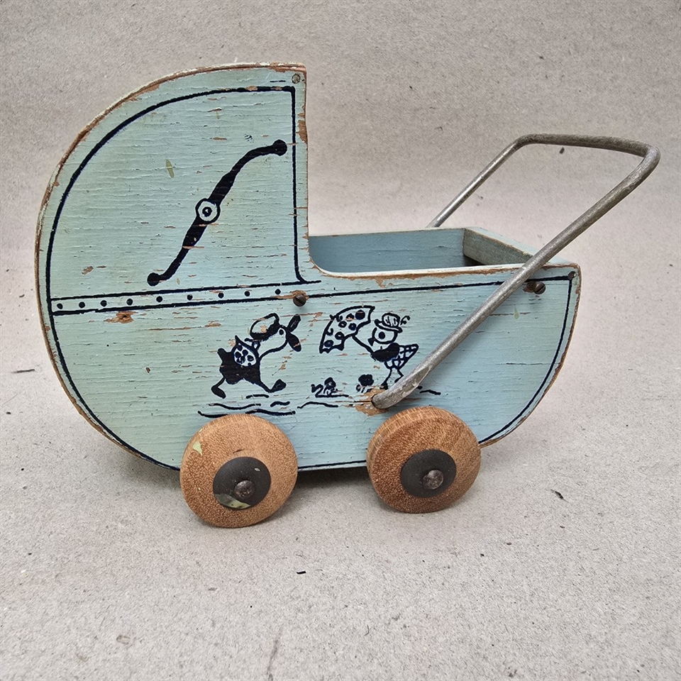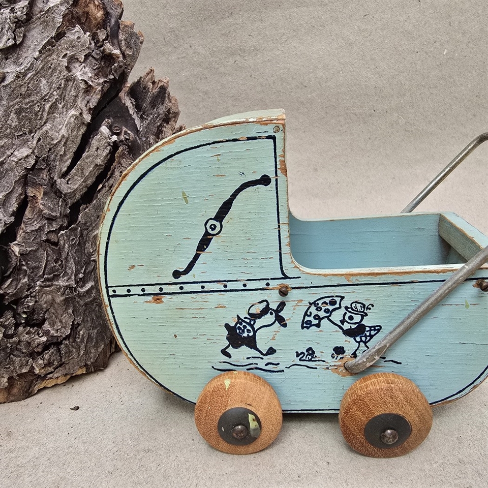 Med sin elegante lyseblå og mørkeblå dekoration, kombineret med naturlige træhjul, er denne dukkevogn ikke kun en fryd for øjet, men også fremstillet med fokus på detaljer.