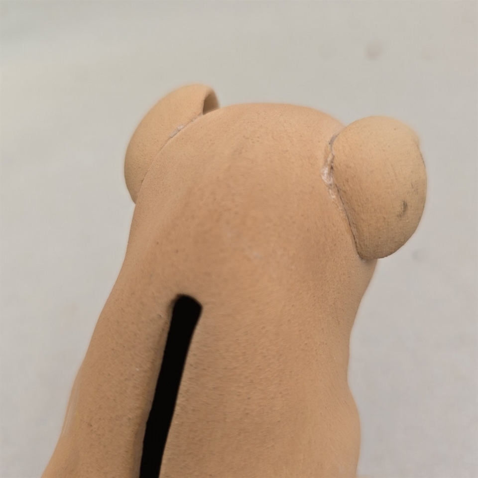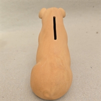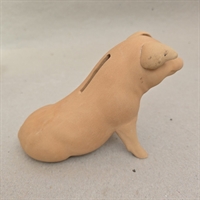 Denne bedårende sparegris, fremstillet i naturfarvet ler og keramik, står stolt med en højde på 12 cm. og tilføjer et rustikt touch til enhver hylde eller skrivebord.