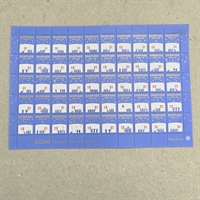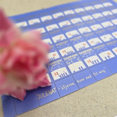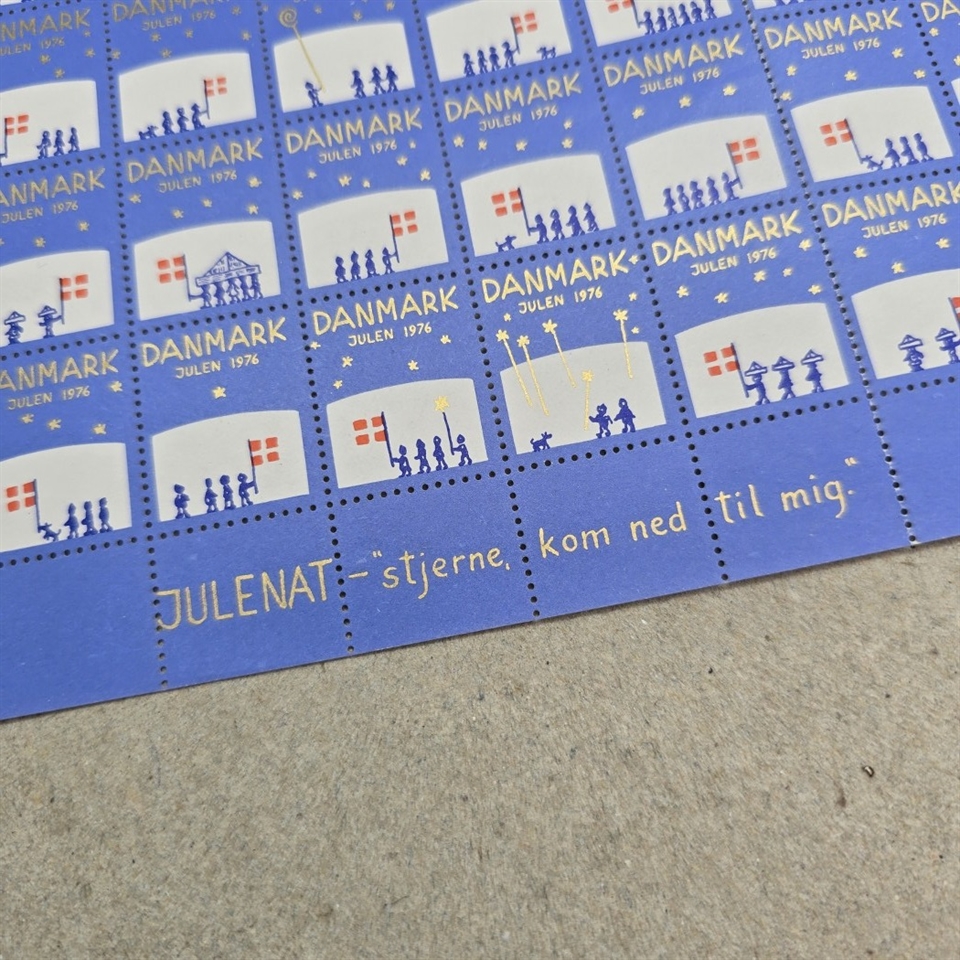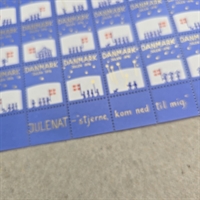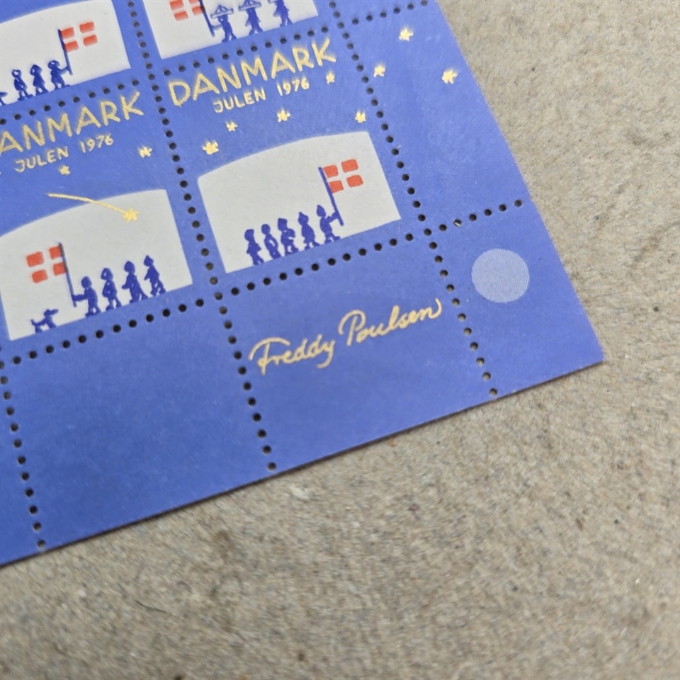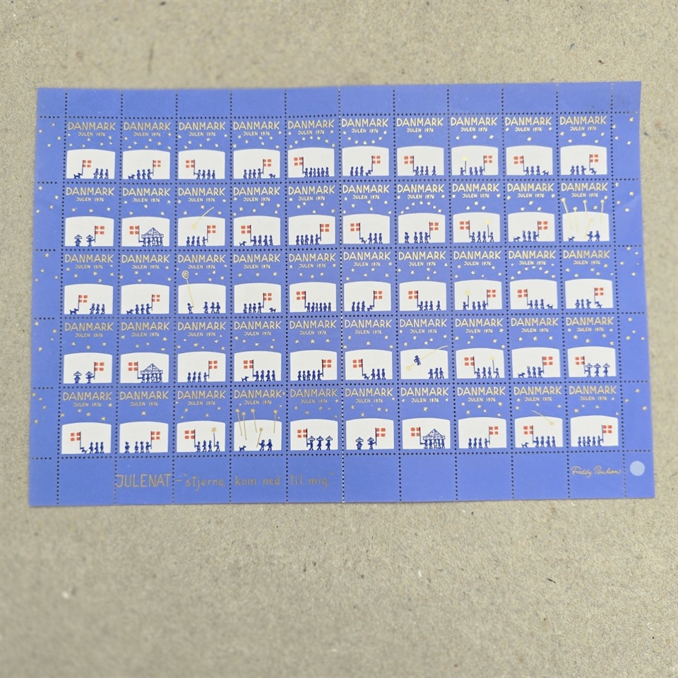 Opdag en sjælden skat fra fortiden med vores eksklusive 'Hel ark julemærker af Freddy Poulsen fra 1976'! Dette unikke ark julemærker, designet af den anerkendte kunstner Freddy Poulsen, er en ægte perle for samlere og julenostalgikere. Mærkerne præsenterer en charmerende blå-hvid-rød farvepalet og er smukt dekoreret med små folk og Dannebrogsflag, som symboliserer dansk kultur og tradition.