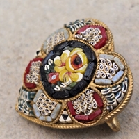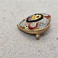 Dette imponerende stykke vintage smykkekunst er en hyldest til tidløs elegance og raffinement. Broche er omhyggeligt sammensat af multifarvet italiensk glasmosaik, hvilket skaber et betagende visuelt display, der fanger øjet.