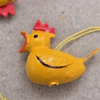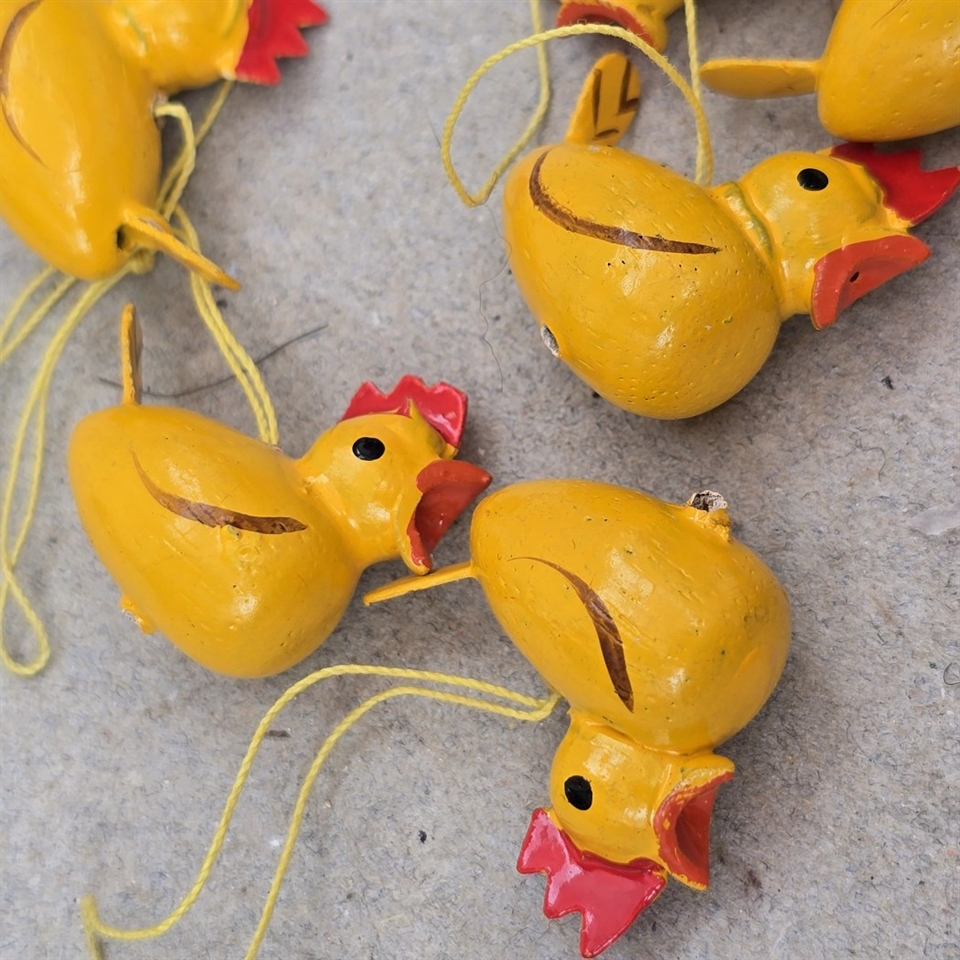 Hver høne er omhyggeligt håndlavet i træ, malet i en livlig gul farve med iøjnefaldende røde detaljer på kammen og næbbet, hvilket tilføjer en autentisk vintage charme til dit påskebord eller dekorationsdisplay.