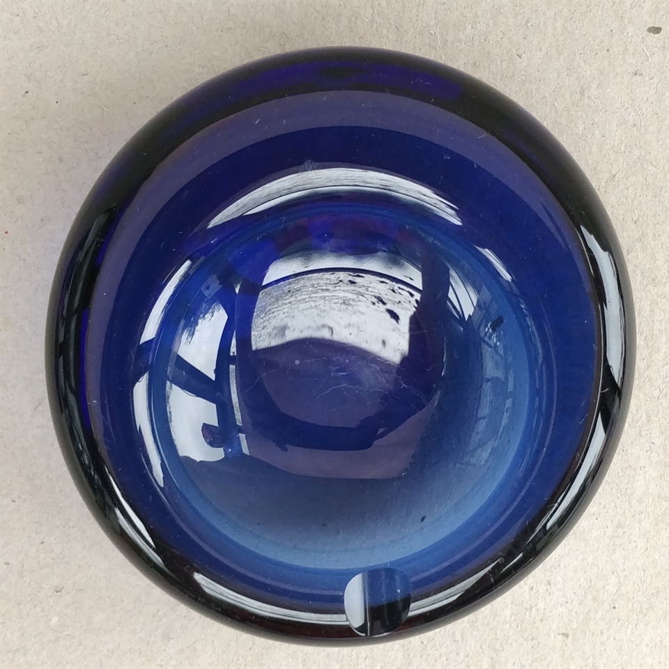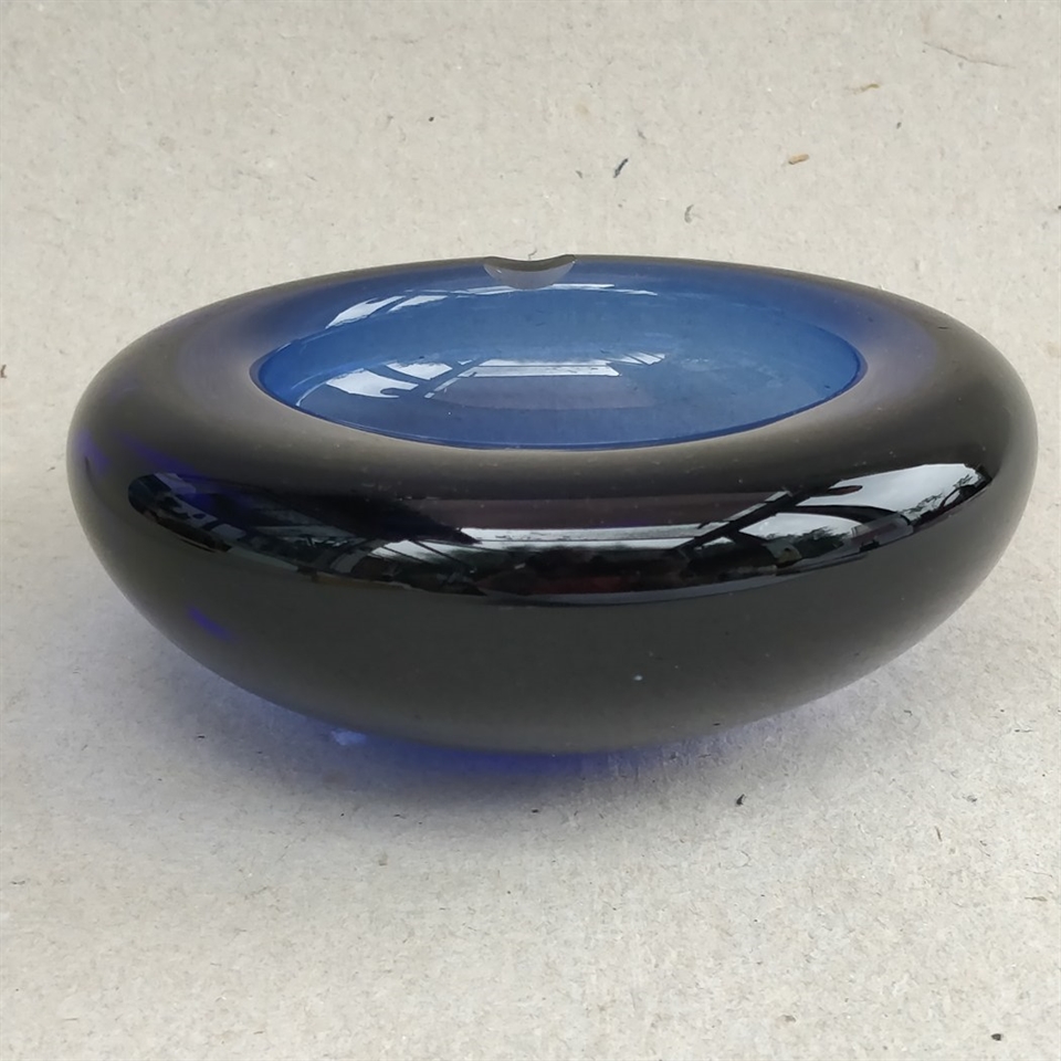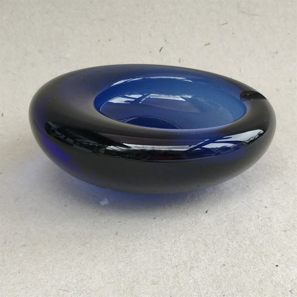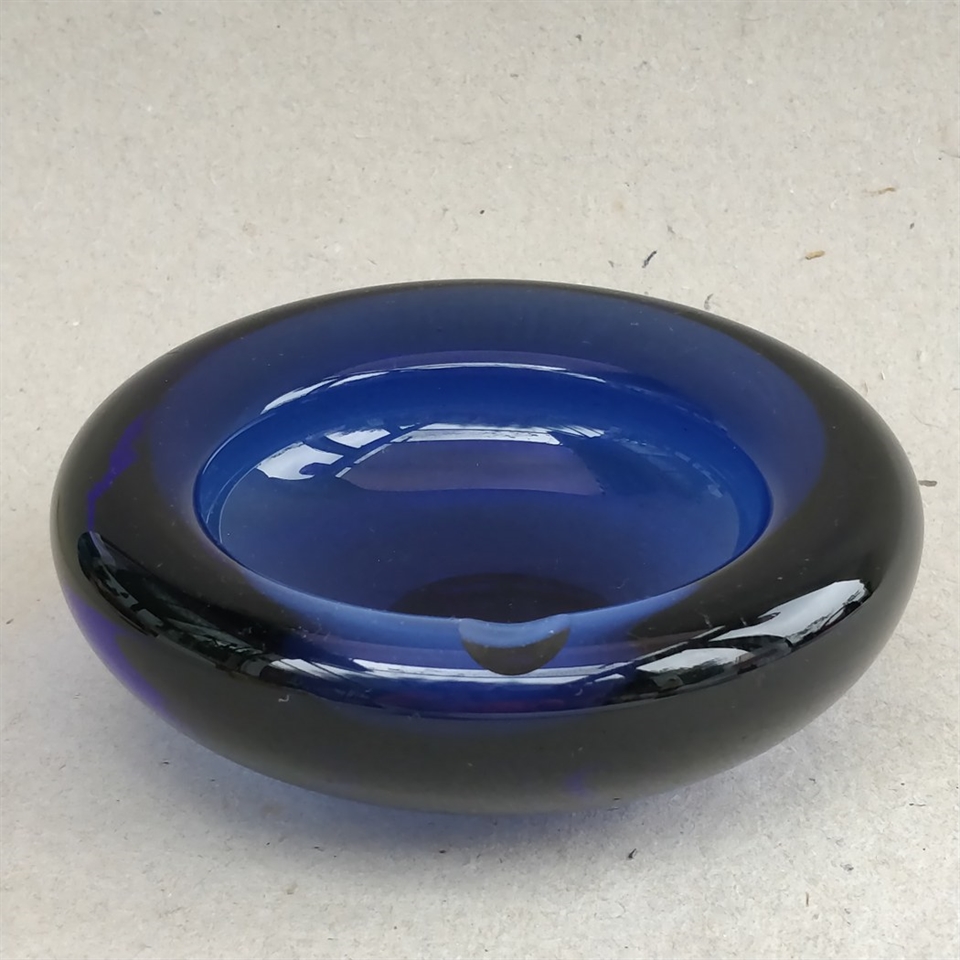Opdag den elegante og tidløse 'Holmegaard 1962, tung blå glas skål', et unikt stykke dansk designhistorie.