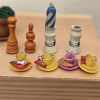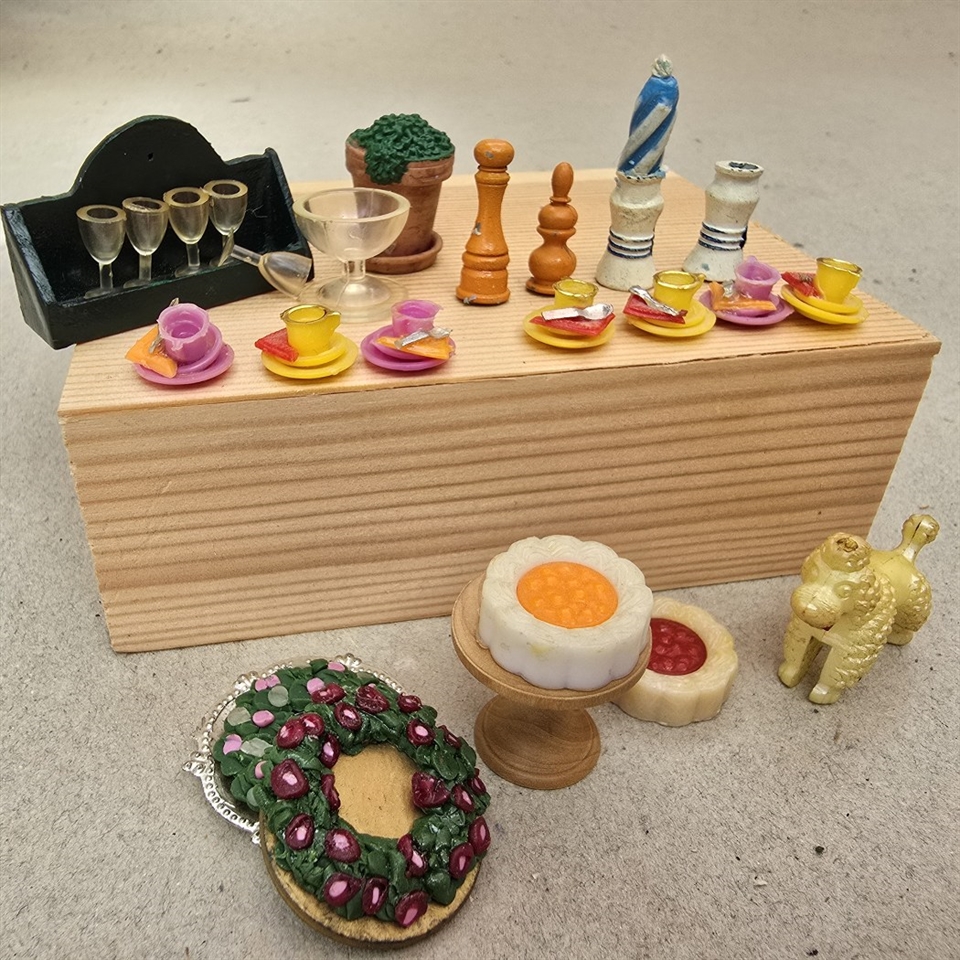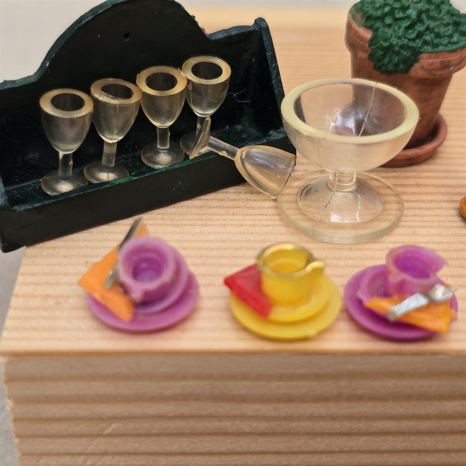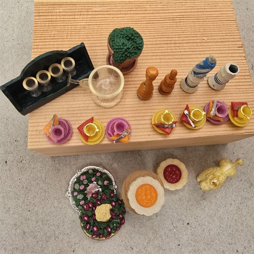 Sættet er ideelt til samlere af miniaturegenstande og enhver, der værdsætter unikke, bæredygtige løsninger. Giv dit dukkehus liv med 'Puddelhund, kager på fad og service til borddækningen', og lad de små detaljer fortælle en stor historie om genbrug og kærlighed til det minutiøse håndværk.