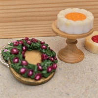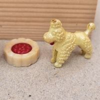 Sættet indeholder en yndig, 4 cm. lang grøn træhylde, hvor en sød puddelhund sidder stolt og vogter over de delikate kager på et smukt opsats.