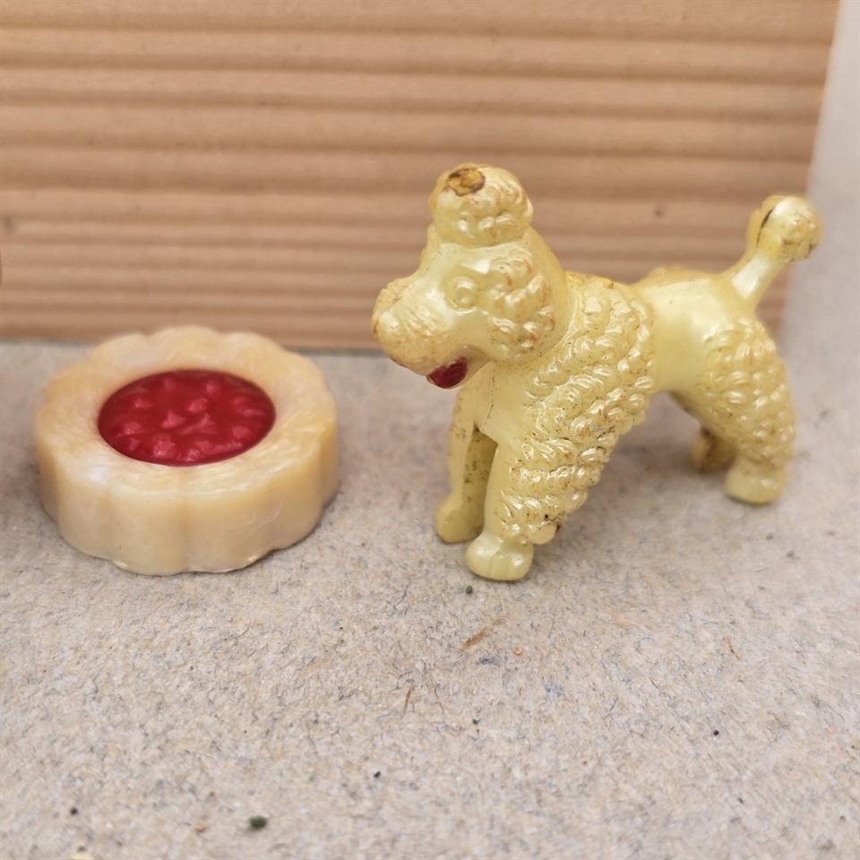 Opdag charmen i miniatureverdenen med 'Puddelhund, kager på fad og service til borddækningen i dukkehuset. Genbrug.' Dette sæt er perfekt til at tilføje et strejf af nostalgi og elegance til dit dukkehus.