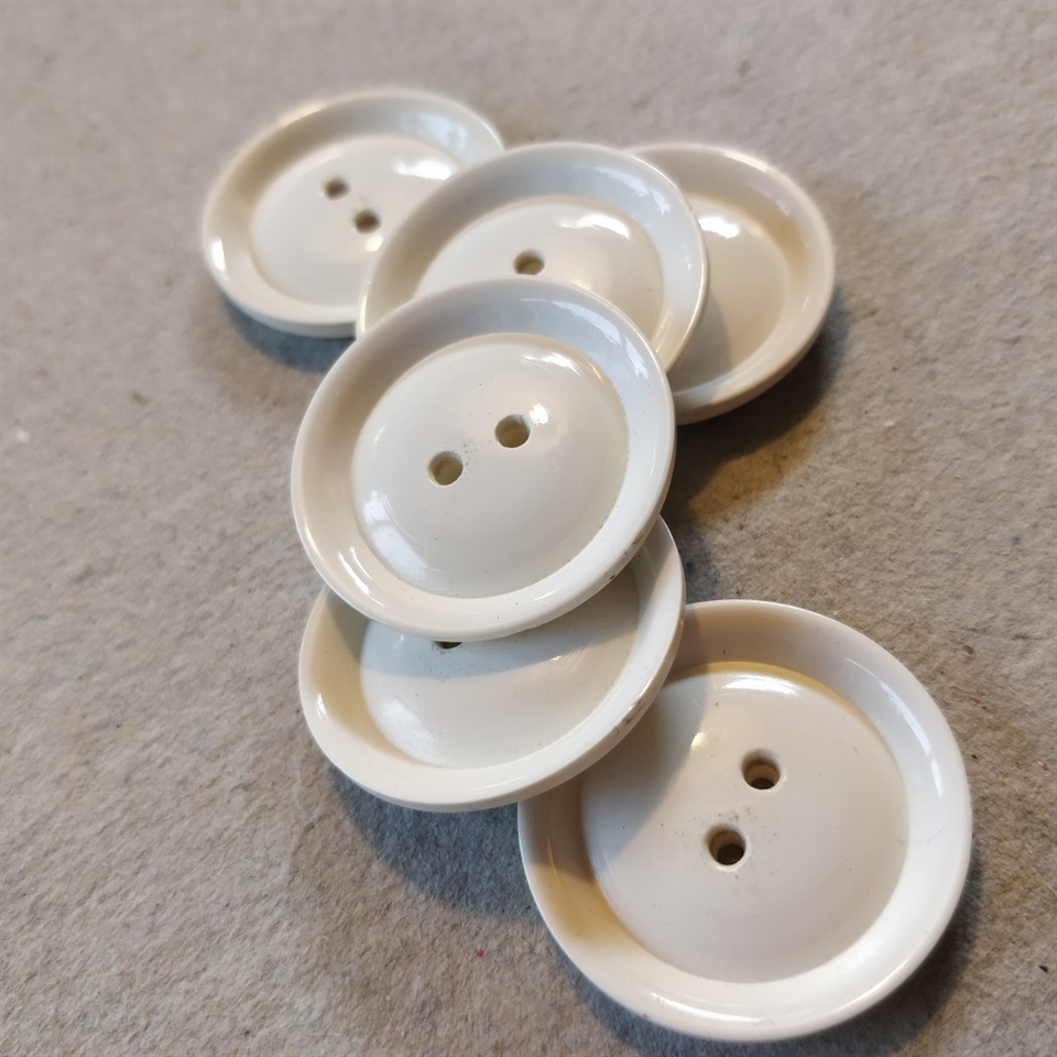 Med vores 'Hvid rund høj kant, retro knap i plastik, 6 stk.' sæt, får du ikke kun funktionalitet, men også et tidløst design, der tilføjer charme og karakter til enhver kreation.
