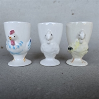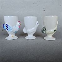 Sættet består af tre hvide porcelænsæggebægre, hver dekoreret med fine høns-motiver, der tilføjer et hyggeligt og rustikt touch til din borddækning.