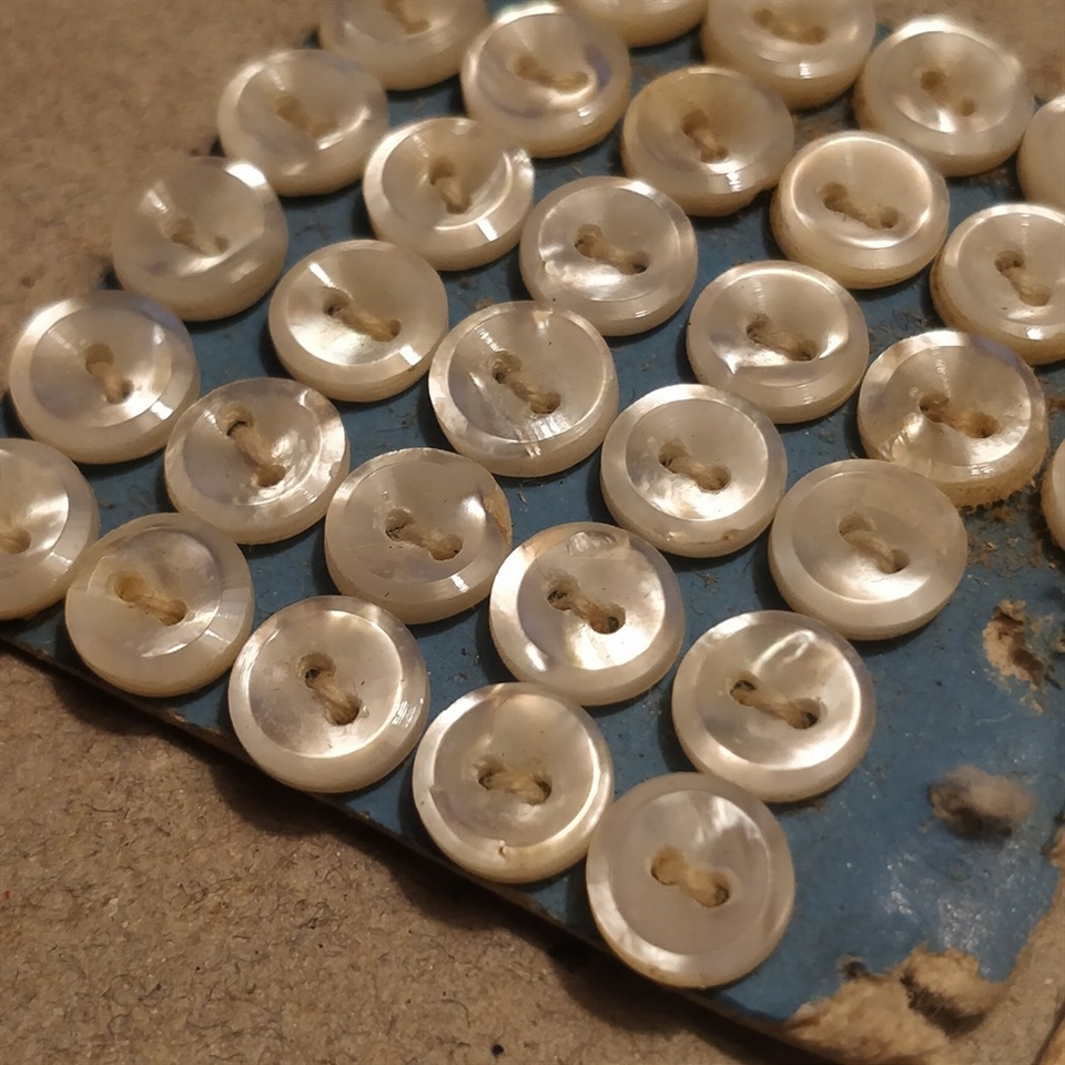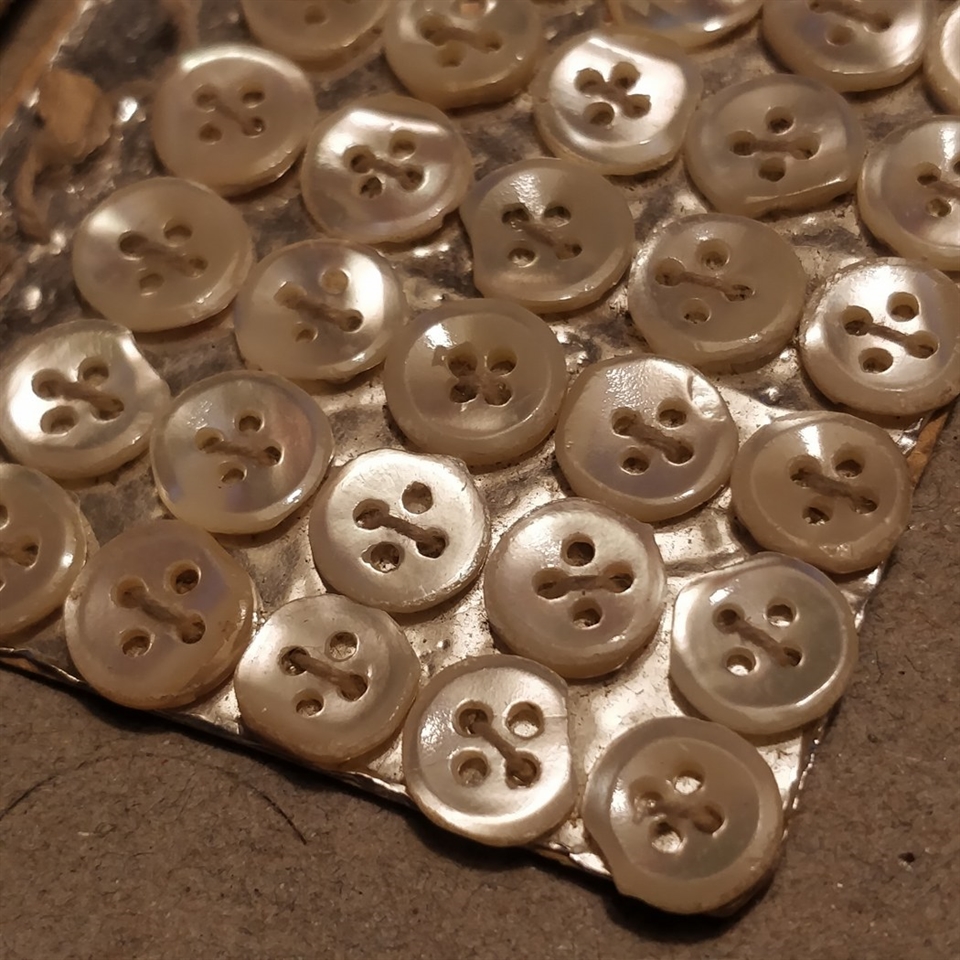 På ark.' Disse elegante knapper tilføjer et klassisk retro touch til enhver skjorte eller bluse. Fremstillet i plastik, hver knap måler mellem 6 til 8 mm. i diameter, hvilket gør dem ideelle til både små detaljer og fremtrædende funktioner på dit tøj.