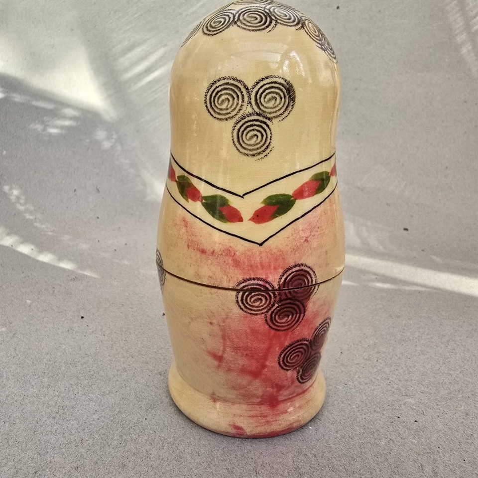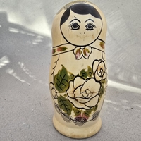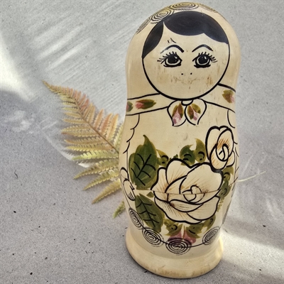 Dukken fortæller sin egen historie med sit sarte, hvidlige finish, der skiller sig ud og tilføjer en moderne twist til den traditionelle babushka. Dens antikke udseende er ikke kun en fryd for øjet, men bærer også på en rig historie, som vil berige enhver samling.