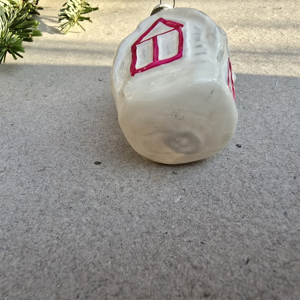 Denne bedårende julekugle forestiller et lille, idyllisk hvidt hus, komplet med livlige pink detaljer på både vindue og dør, der tilføjer et pop af farve og glæde til din juledekoration.