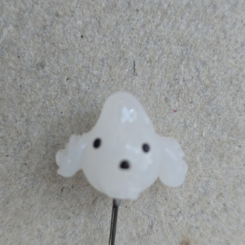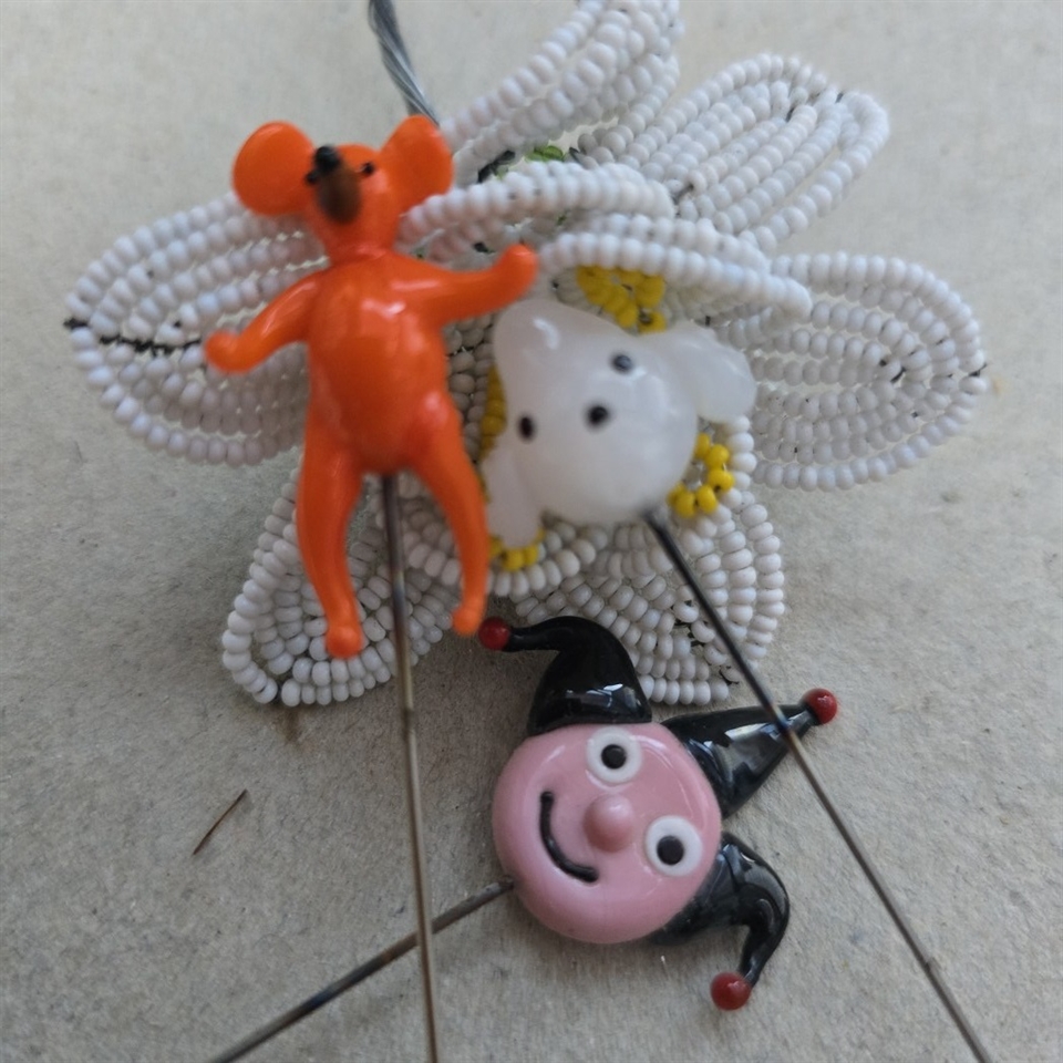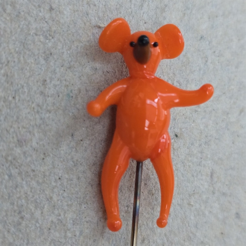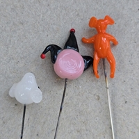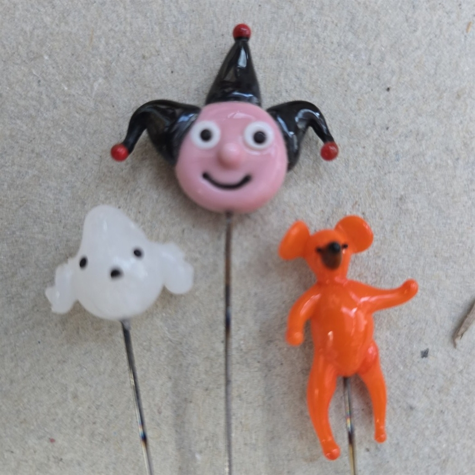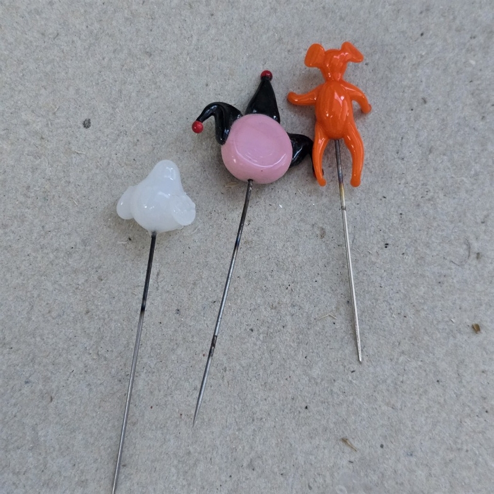 Se denne unikke samling af charmerende nipsenåle med 'Hvidt puddel hoved, orange bamse og et nar hoved, gamle nipsenåle. 3 stk.'.