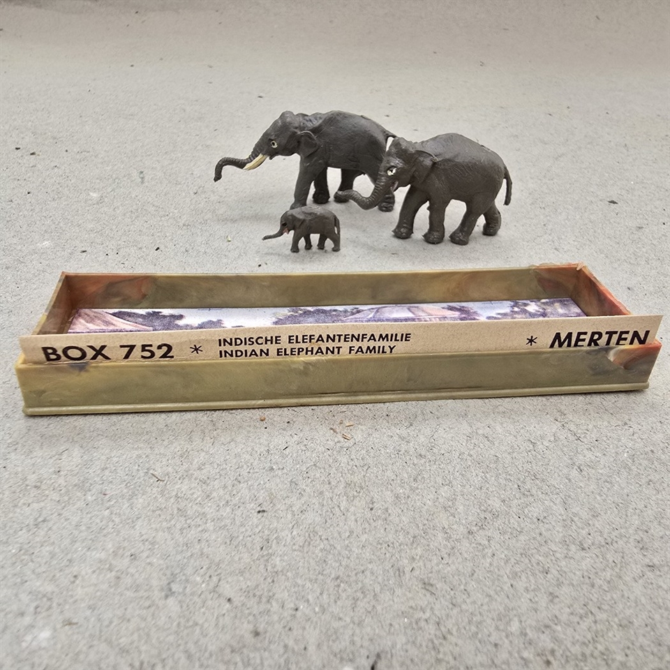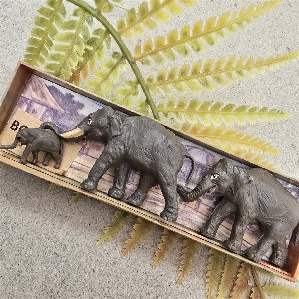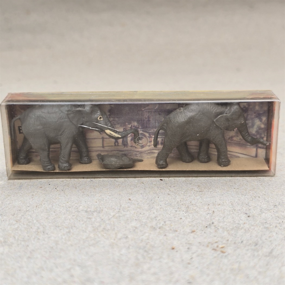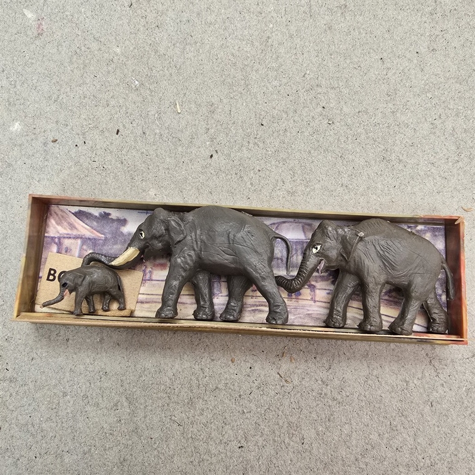 Hver elefant måler op til 3 cm. i højden, perfekt til små hænder eller som en unik tilføjelse til din samling. Sættet kommer i den originale æske, som tilføjer en autentisk følelse af retro-charme og gør det til en ideel gave til samlere eller som en sjov dekoration i hjemmet.