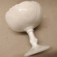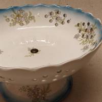 Pragtfuld skål, i bådfacon, med blomster dekorationer.