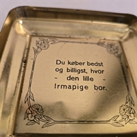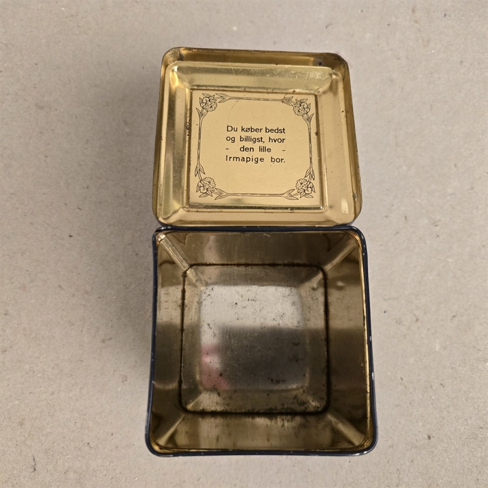 Opdag charmen af vintage med denne ældre, firkantede metaldåse fra Irma, kendt som 'Irmadåsen'.