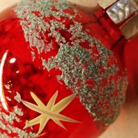 Rød og metalfarvet spejl julekugle, i glas, genbrug.