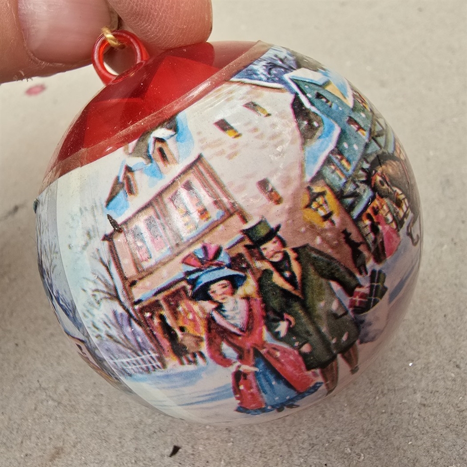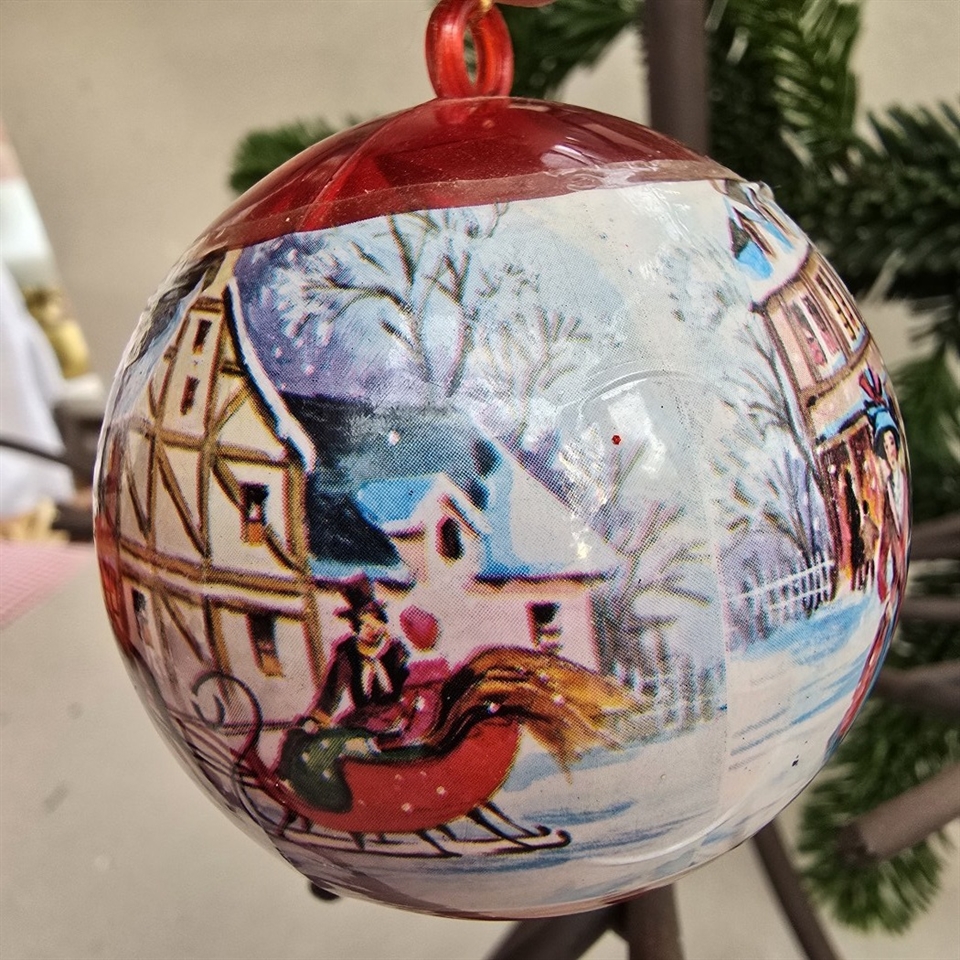 Fremstillet i strålende rød plast, er hver kugle dekoreret med hjertevarmende julemotiver, der vækker minder om barndommens jul.