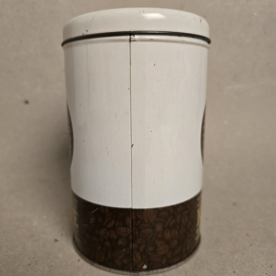 Denne unikke dåse bærer præg af klassisk design med sin tiltalende hvide og brune farvekombination og elegante guldtekst.