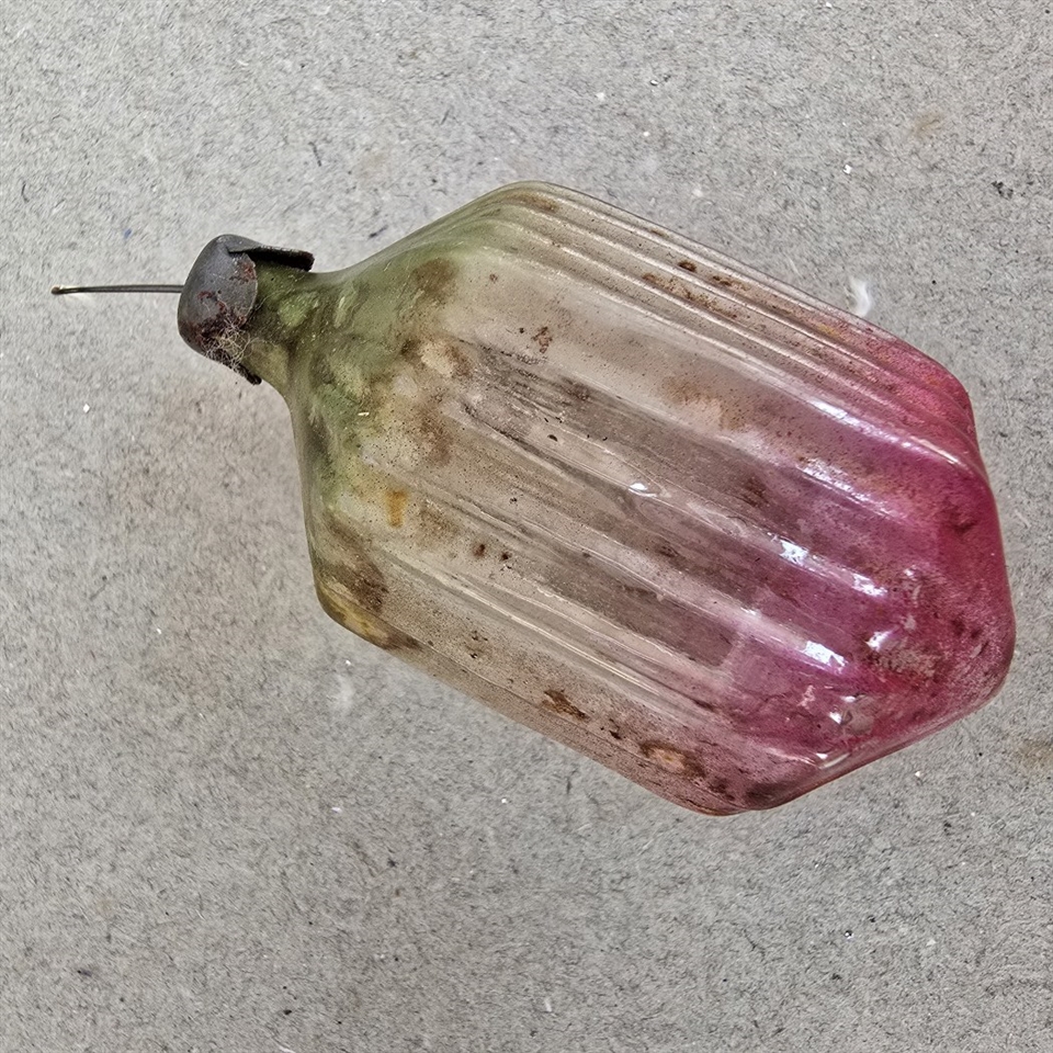 Kuglen er unikt rillet, hvilket tilføjer en forførende tekstur og et dybde, der vil tiltrække beundrende blikke fra alle, der ser den. Om du er en samler af antik julepynt eller bare leder efter det perfekte nostalgiske element til dit træ, er denne gamle glas juletræskugle det ideelle valg.