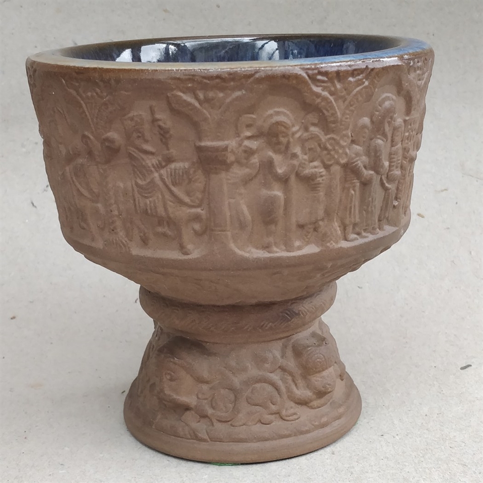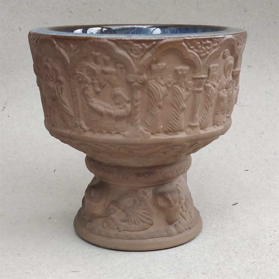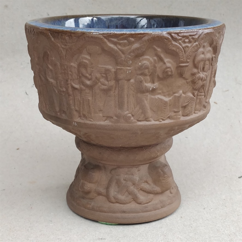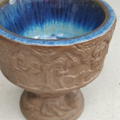 Opdag charmen ved håndlavet keramik med 'Keramikkrukke på fod med indvendig blå glasering', et unikt stykke til din indretning.