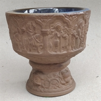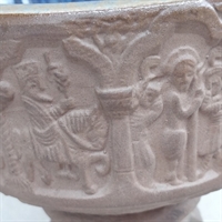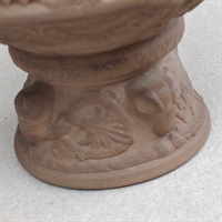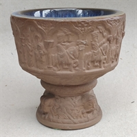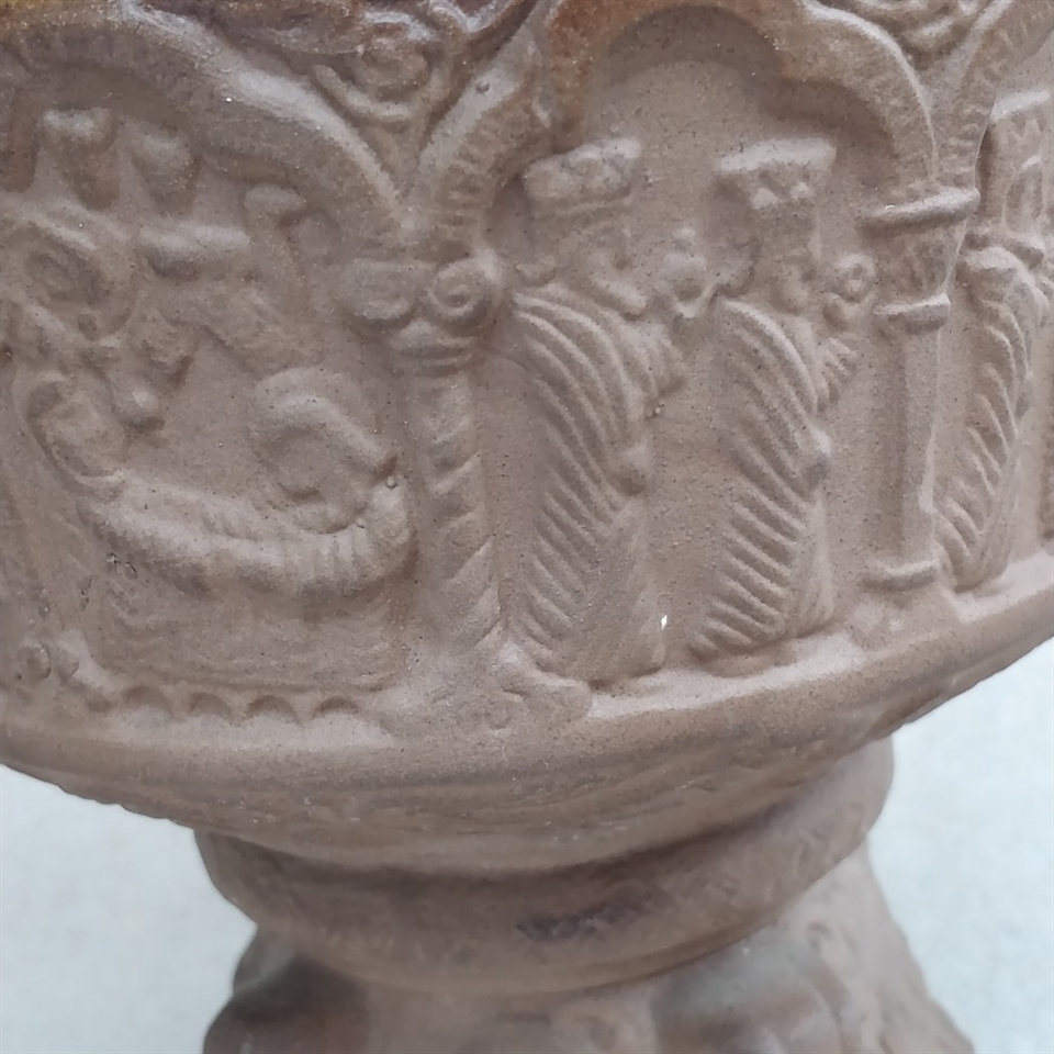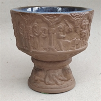 Denne keramikkrukke fremviser en rå, ubehandlet ydre overflade dekoreret med traditionelle motiver, der skildrer folk og søjler, hvilket tilføjer et rustikt og historisk præg til designet.