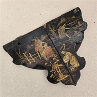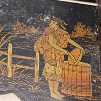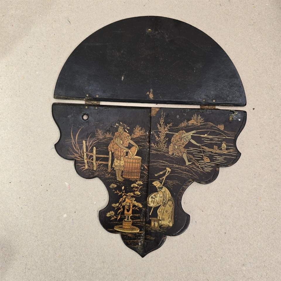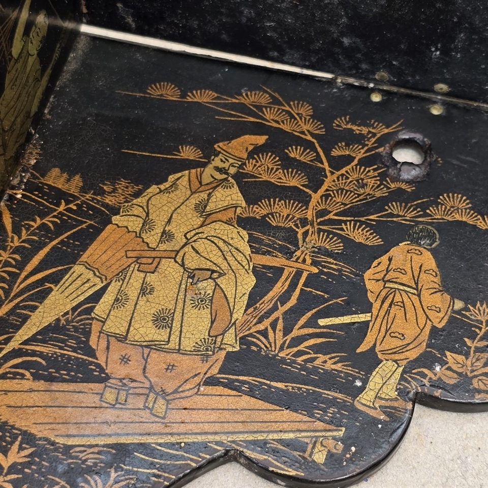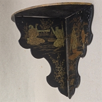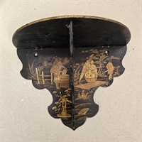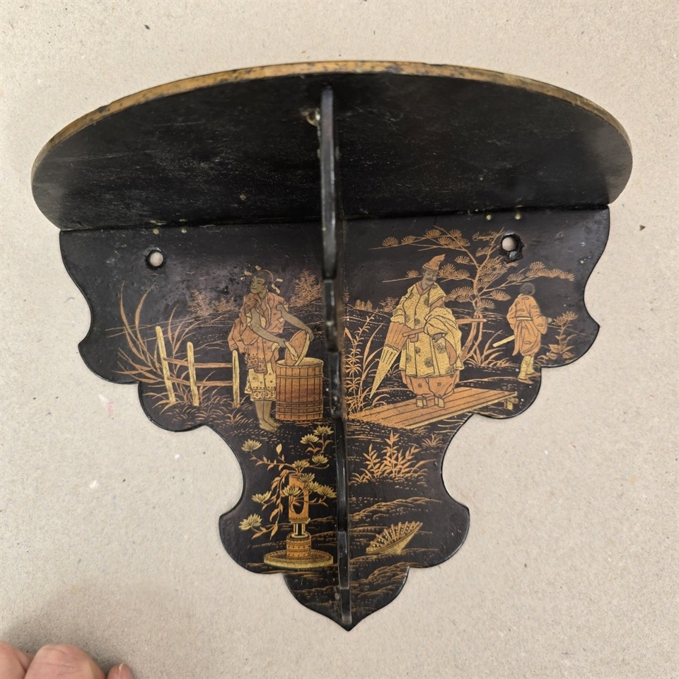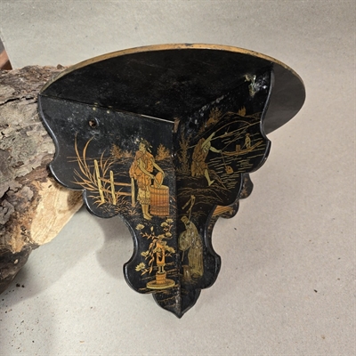 Denne væghylde er omhyggeligt udformet med smukke, gyldne kinesiske malerier på en elegant sort baggrund, hvilket skaber en iøjnefaldende kontrast, der vil fange blikket i ethvert rum.