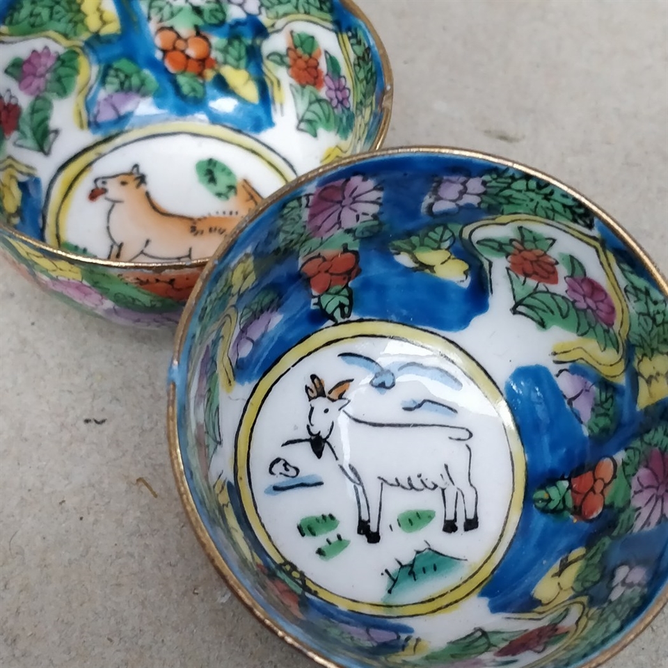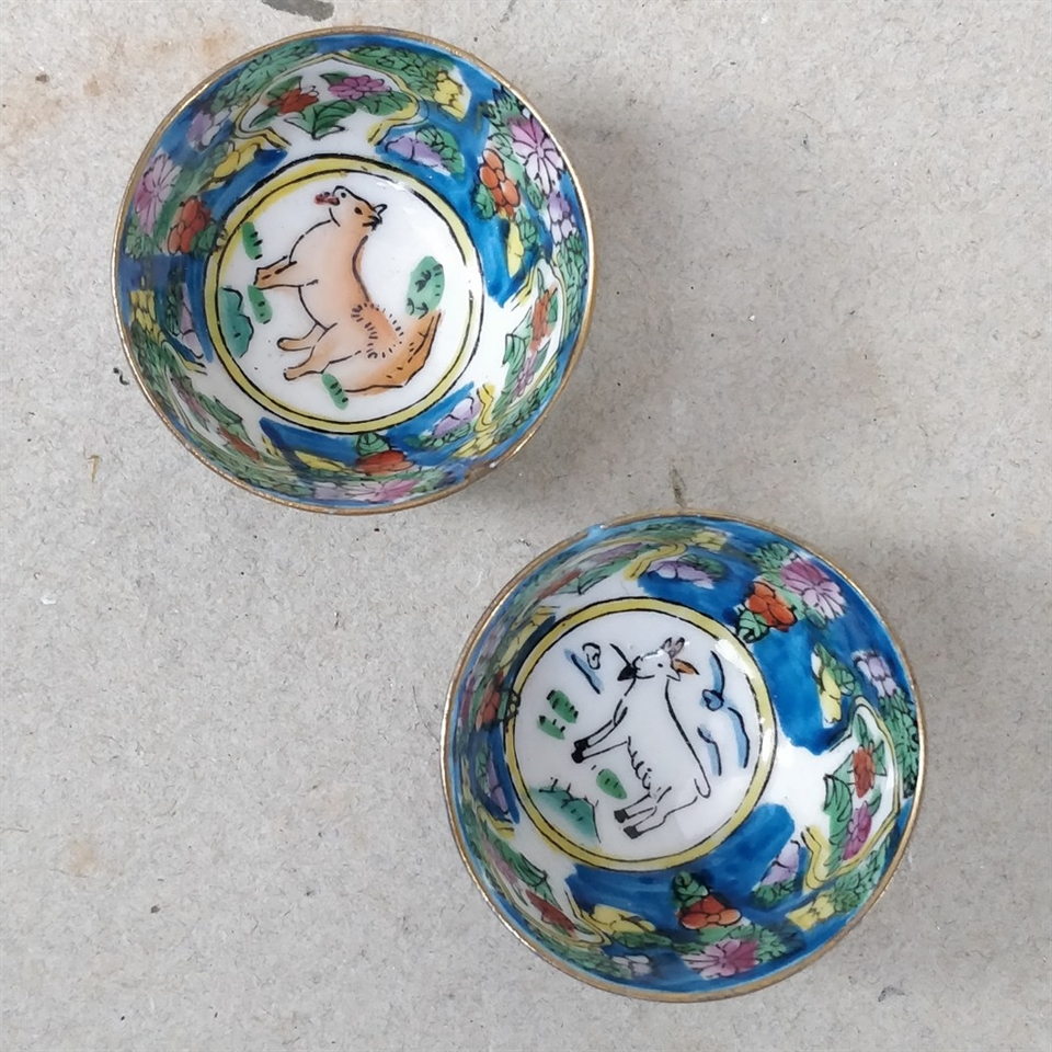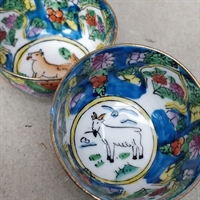 Hver skål er dekoreret med farverige, livlige motiver, der forestiller de kinesiske zodiaktegn hund og ged, hvilket gør dem ikke kun til en funktionel genstand, men også en betydningsfuld og dekorativ tilføjelse.