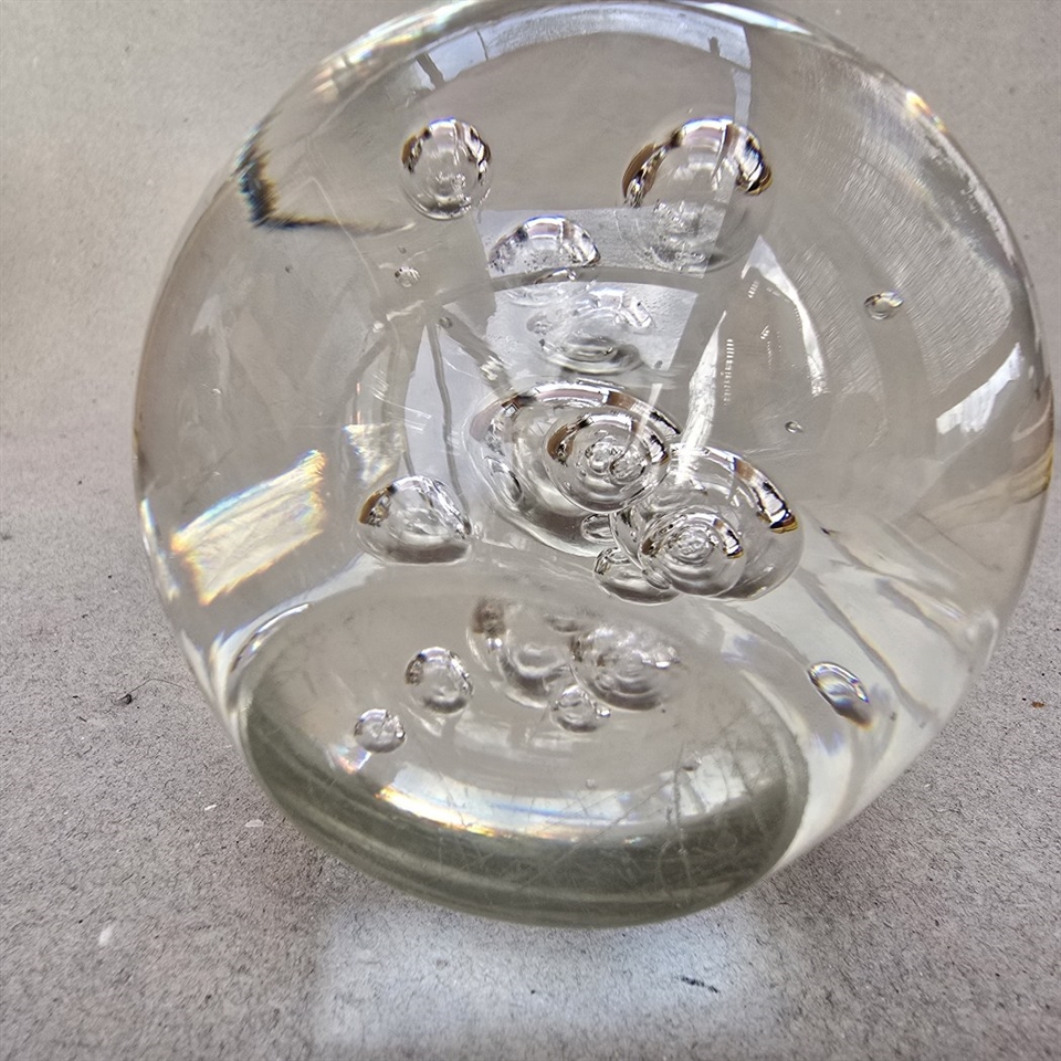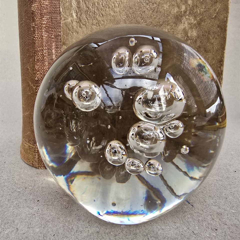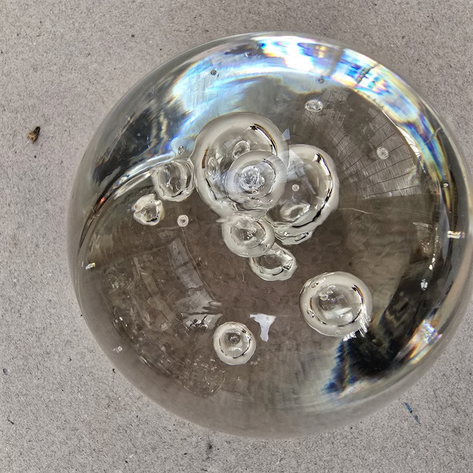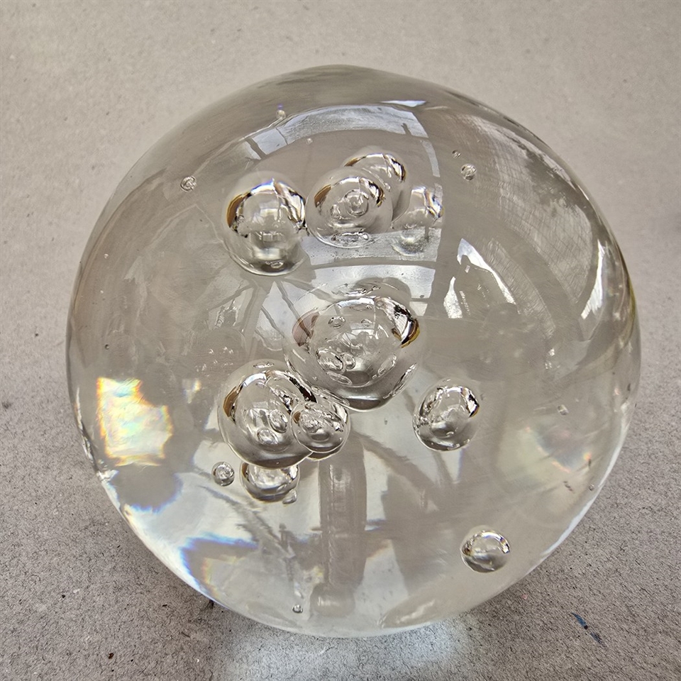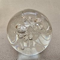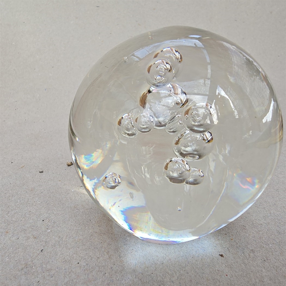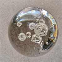 Hver kugle er omhyggeligt håndlavet i Sverige, og måler imponerende 8 cm. i diameter, hvilket giver den en perfekt størrelse til både at holde dine papirer på plads og fange øjet med sin skønhed. Inde i den klare glasstruktur er små luftbobler fanget, hvilket skaber et livligt og dynamisk udseende, der ændrer sig med lysets spil.