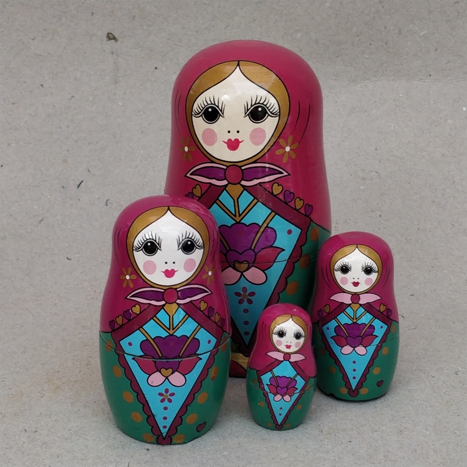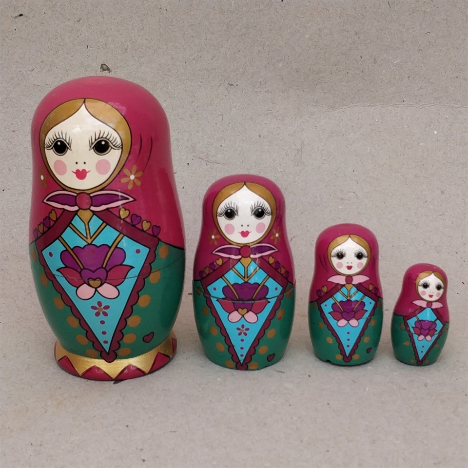 Opdag glæden ved traditionelt russisk håndværk med vores sæt af 4 klare farvede babushka trædukker.