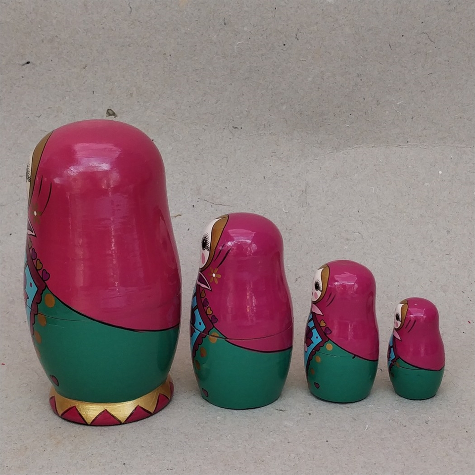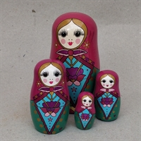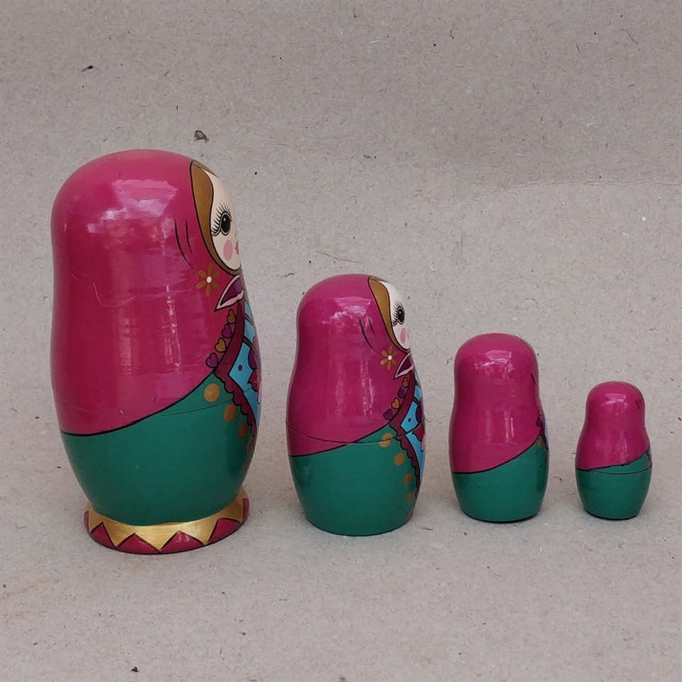 Sættet indeholder fire matryoshka-dukker, der måler fra 4 til 12 cm. i højden.