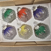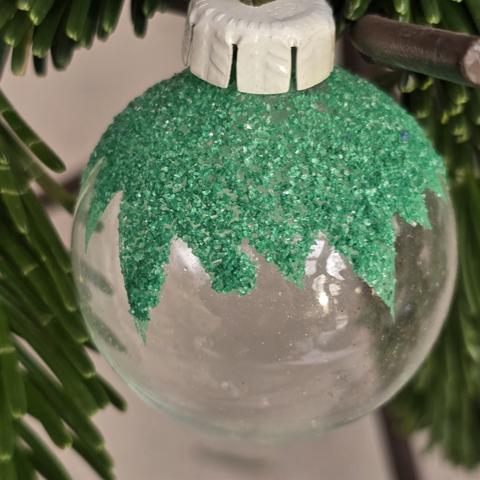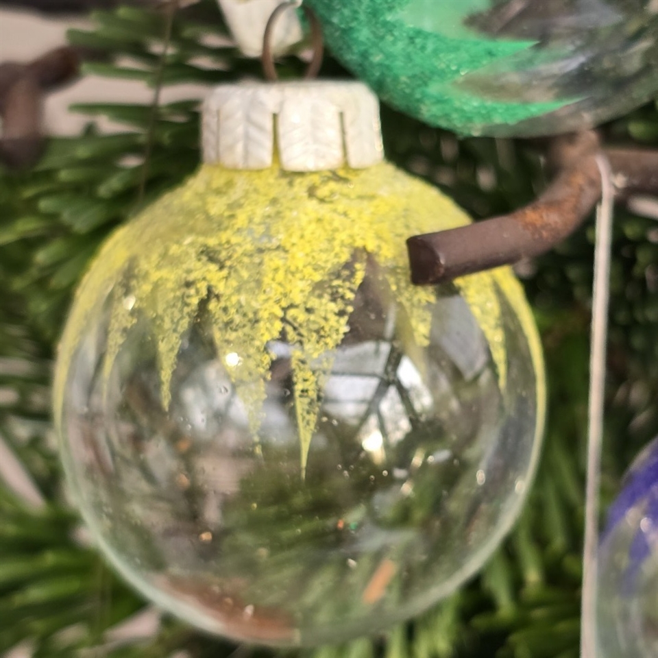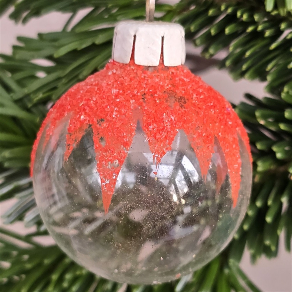 Giv dit juletræ et strejf af nostalgisk charme med vores eksklusive sæt af 'Klare vintage glas juletræskugler med farvet sukker is'.