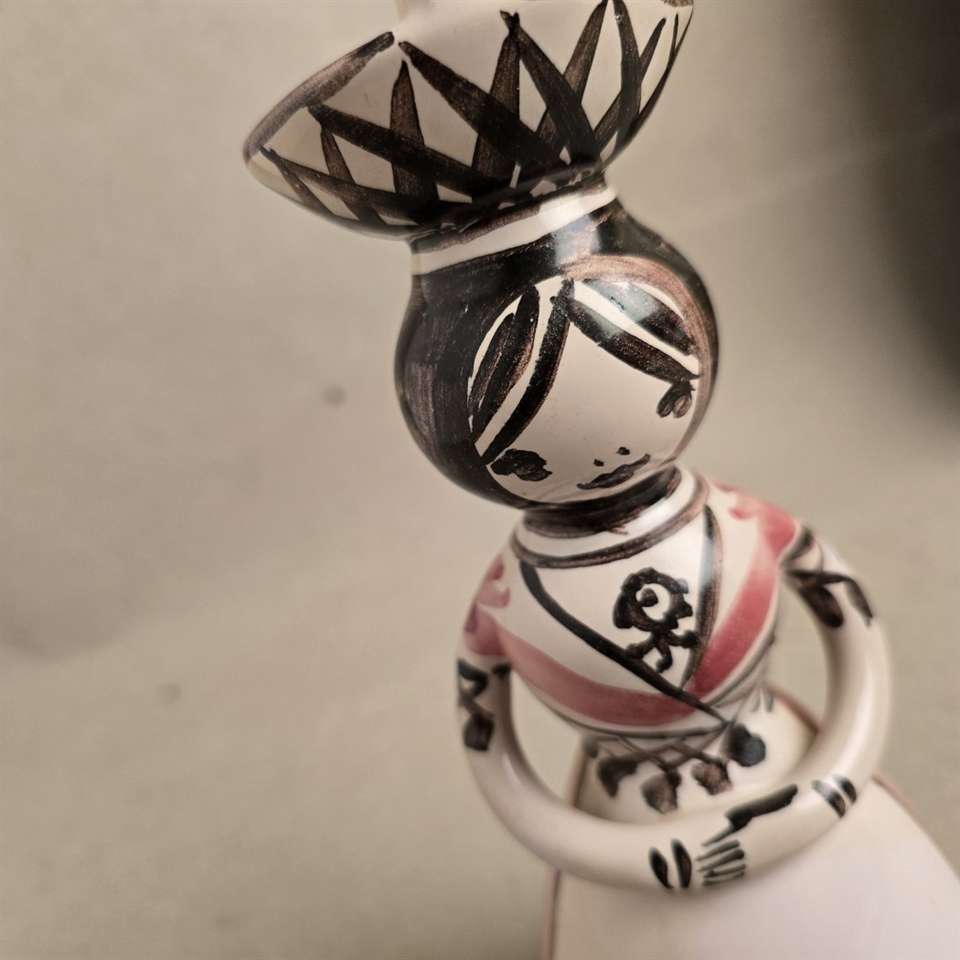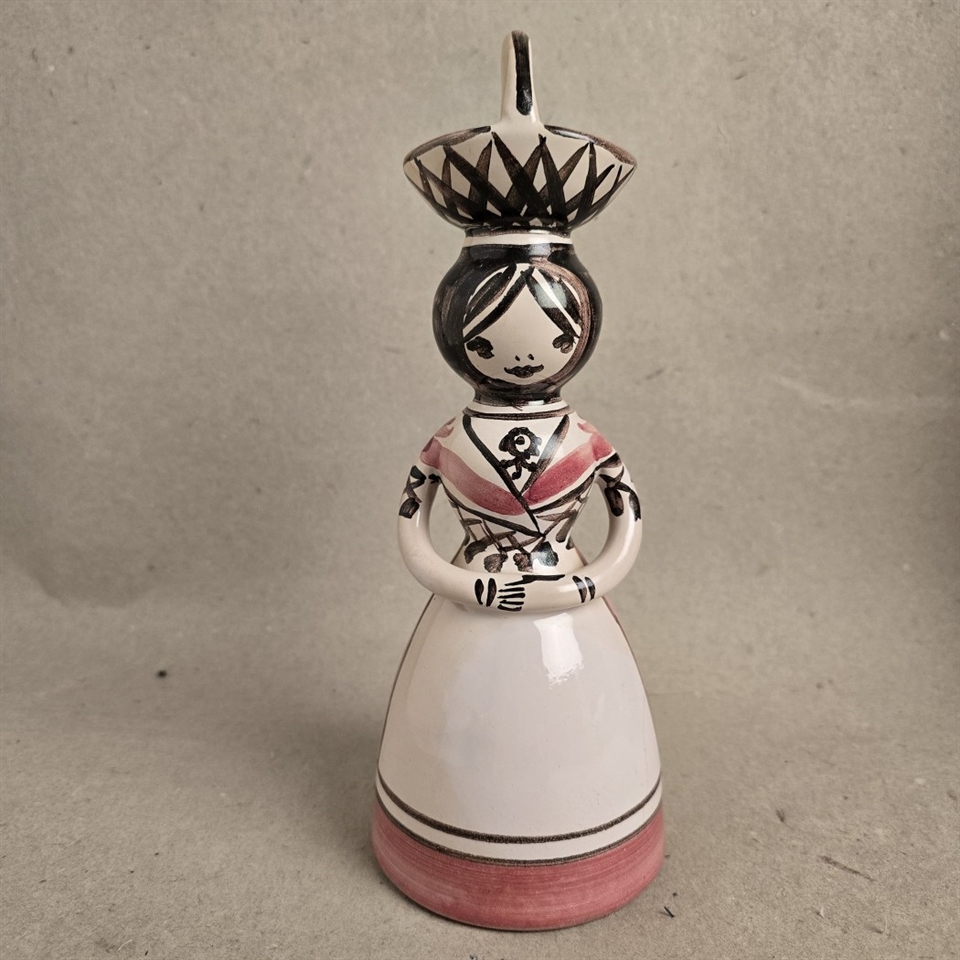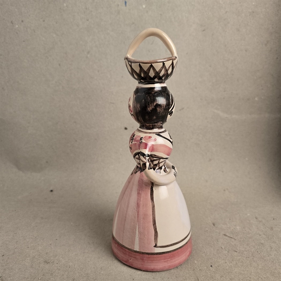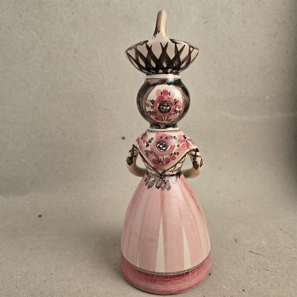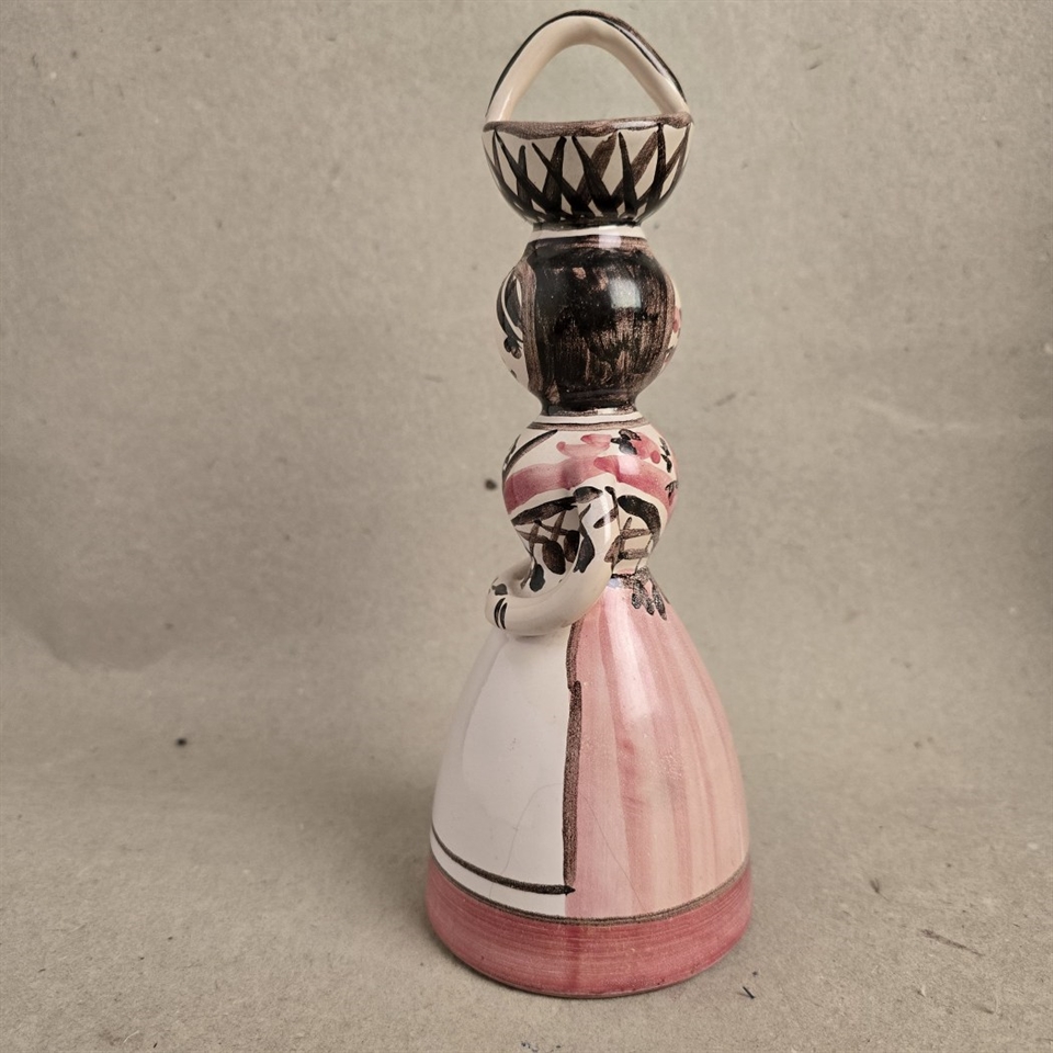 Denne fascinerende figur står 23,5 cm. høj og fanger øjet med sin smukke rosa, hvid og brun glasur. Den detaljerede kurv, balanceret elegant på damens hoved, tilføjer et strejf af mystik og fortælling til dette håndværk.