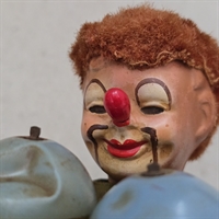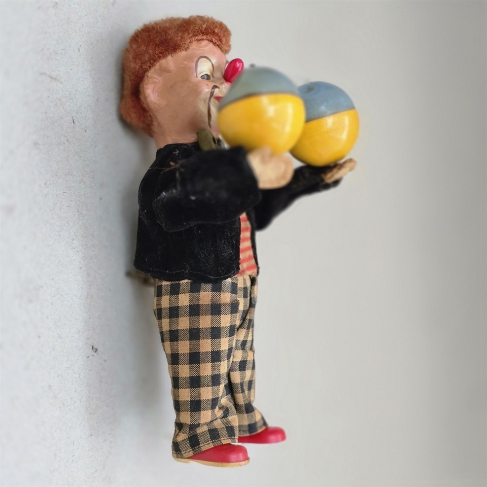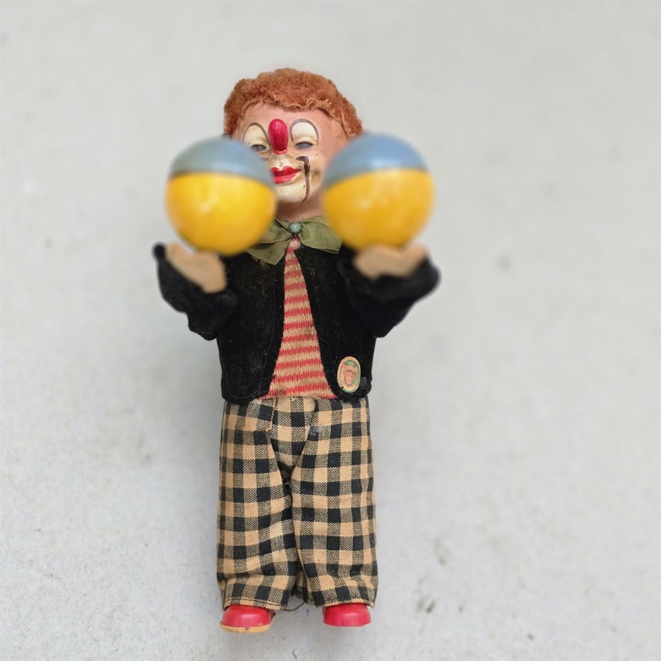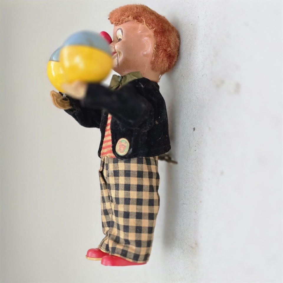 Opdag charmen fra fortiden med dette nostalgiske "Klovn i ternede bukser med bolde" optræk legetøj! Denne farverige klovnefigur vil med sikkerhed vække glæde og minder.