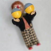 Med sin iøjnefaldende røde næse og klassiske sort-hvide ternede bukser, komplementeret af sprudlende røde sko, tilfører denne klovn et strejf af vintage til enhver samling. I hænderne holder den farvestrålende bolde i blå og gule nuancer, som tilføjer ekstra charme og karakter.