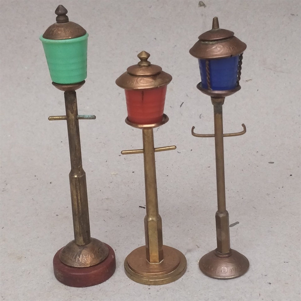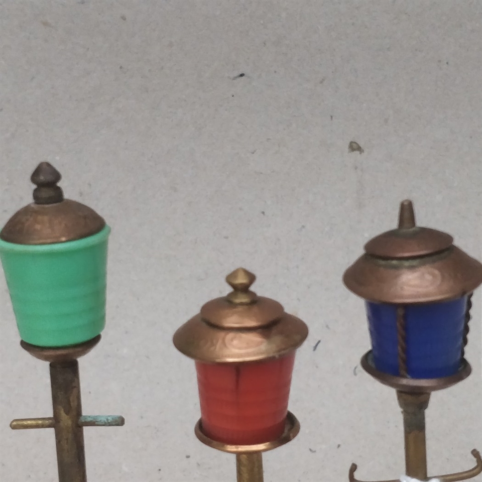 Opgrader din udendørs belysning i dit dukkehus, med elegance og stil med vores "Kobbermønt gadelamper med fingerbøl lampeskærme, 3 stk."