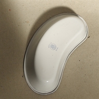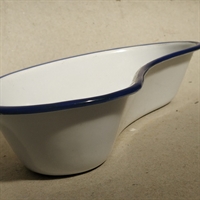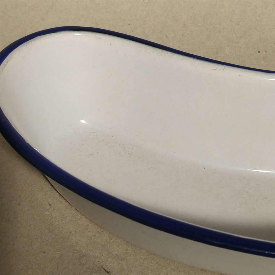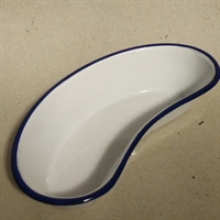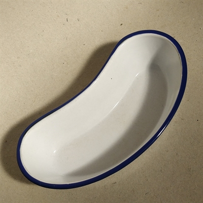 Opdag charmen og funktionaliteten i Kokums bananformede hvidt emaljefad med blå kant, fremstillet med fokus på genbrug og holdbarhed.