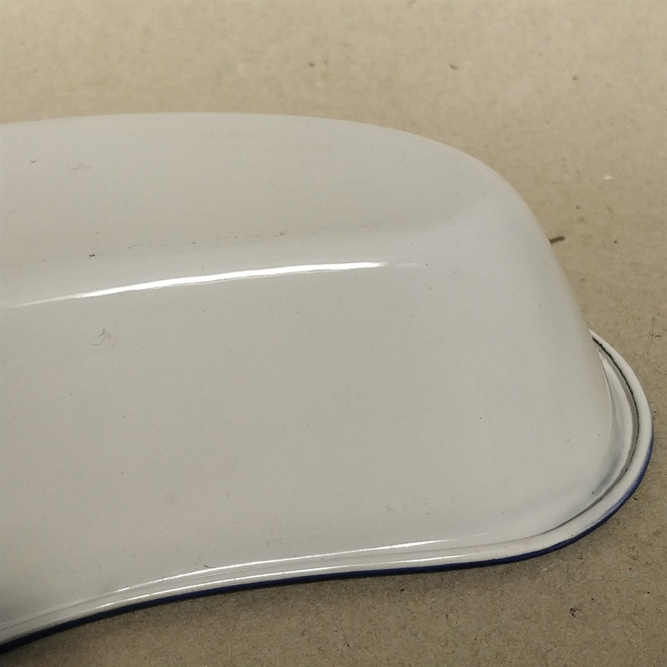 Den hvide emalje er suppleret med en attraktiv blå kant, der tilføjer et frisk og tiltalende visuelt element.