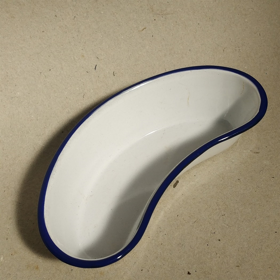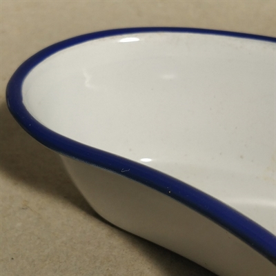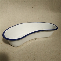 Opdag charmen og elegancen i dit hjem med 'Kokums emaljeret bananformet fad, gammel hvid med blå kant'.