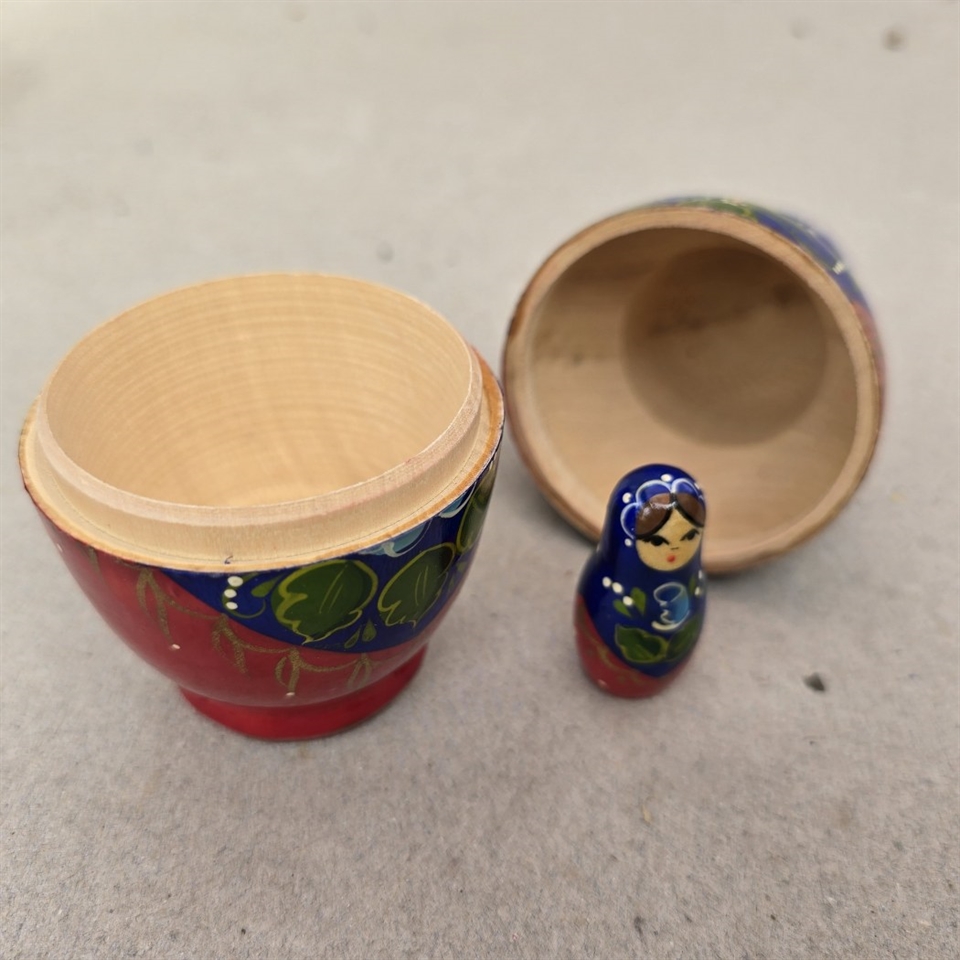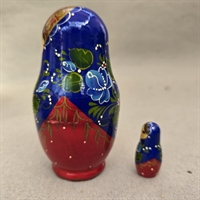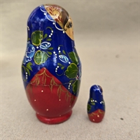 Dette sæt inkluderer dukker i dybe nuancer af kongeblå og vinrød, hver detaljeret fremstillet for at fange essensen af klassisk russisk kunsthåndværk.