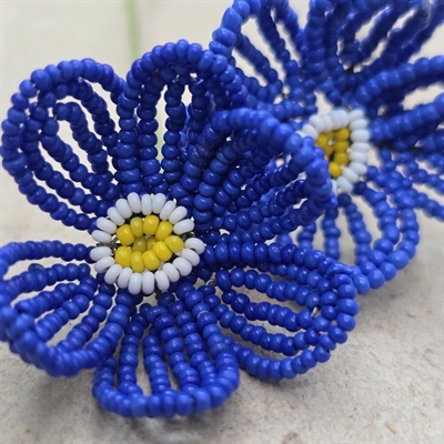 Hver blomst er omhyggeligt håndlavet med udsøgte kongeblå glasperler, der tilføjer en majestætisk elegance til enhver dekoration eller samling. Midten af blomsten er prydet med en delikat hvid og gul nuance, der skaber en fascinerende visuel kontrast, som fanger øjet og beriger sindet.