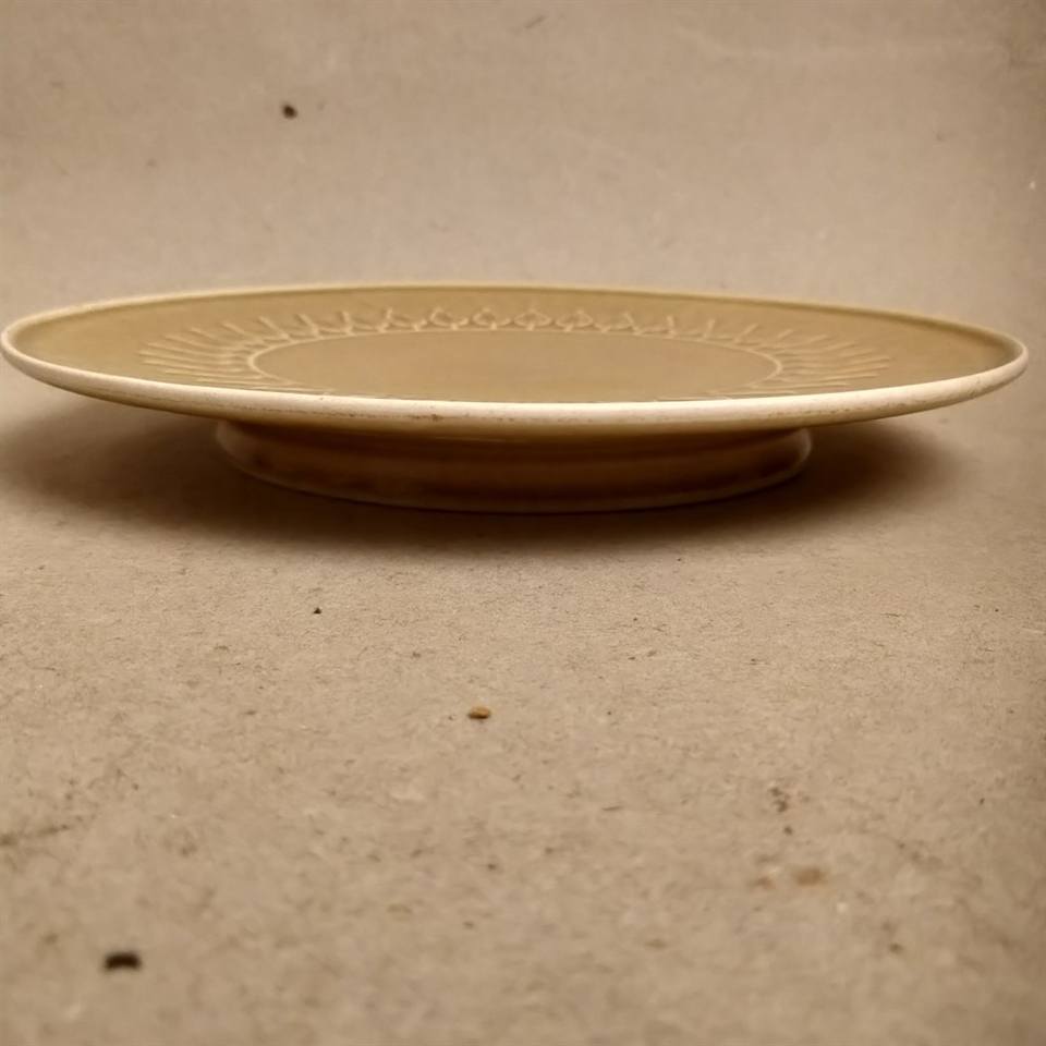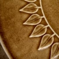 Dette smukke retro serveringsfad er fremstillet i en charmerende lysebrun nuance og prydes af en detaljeret bladdekoration, der tilfører et unikt og kunstnerisk touch til enhver borddækning.