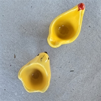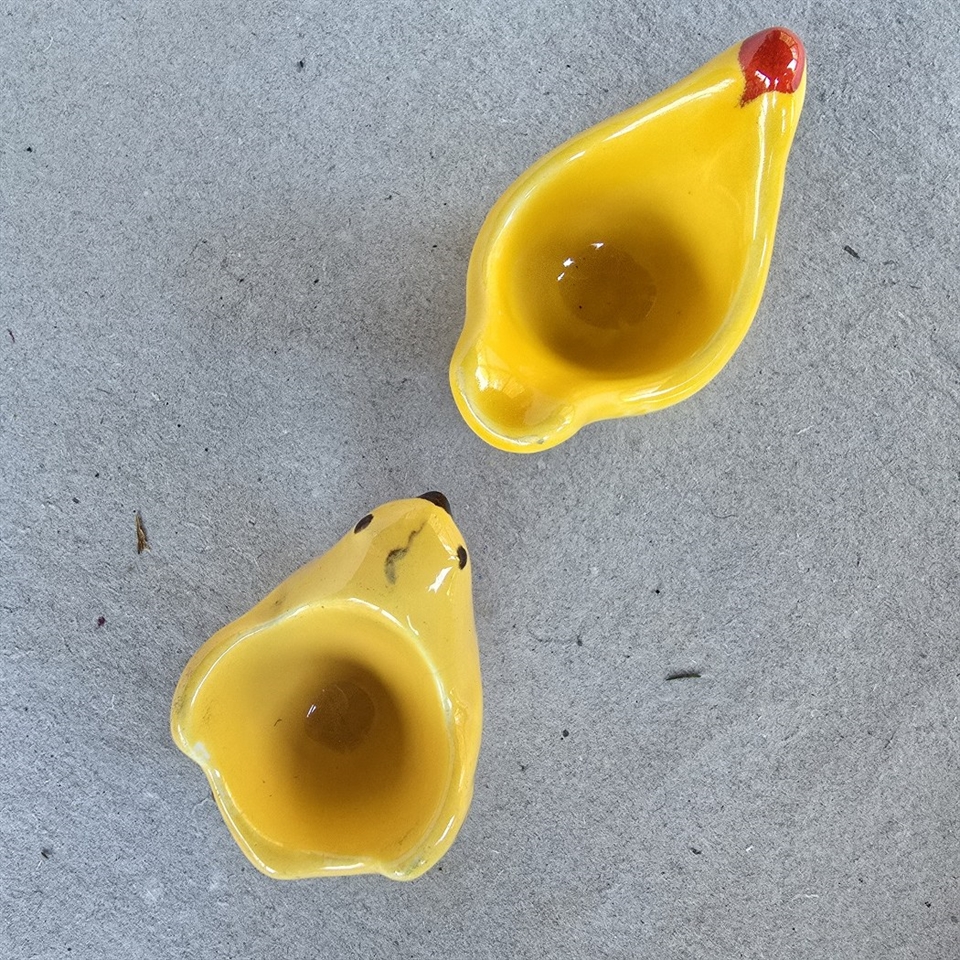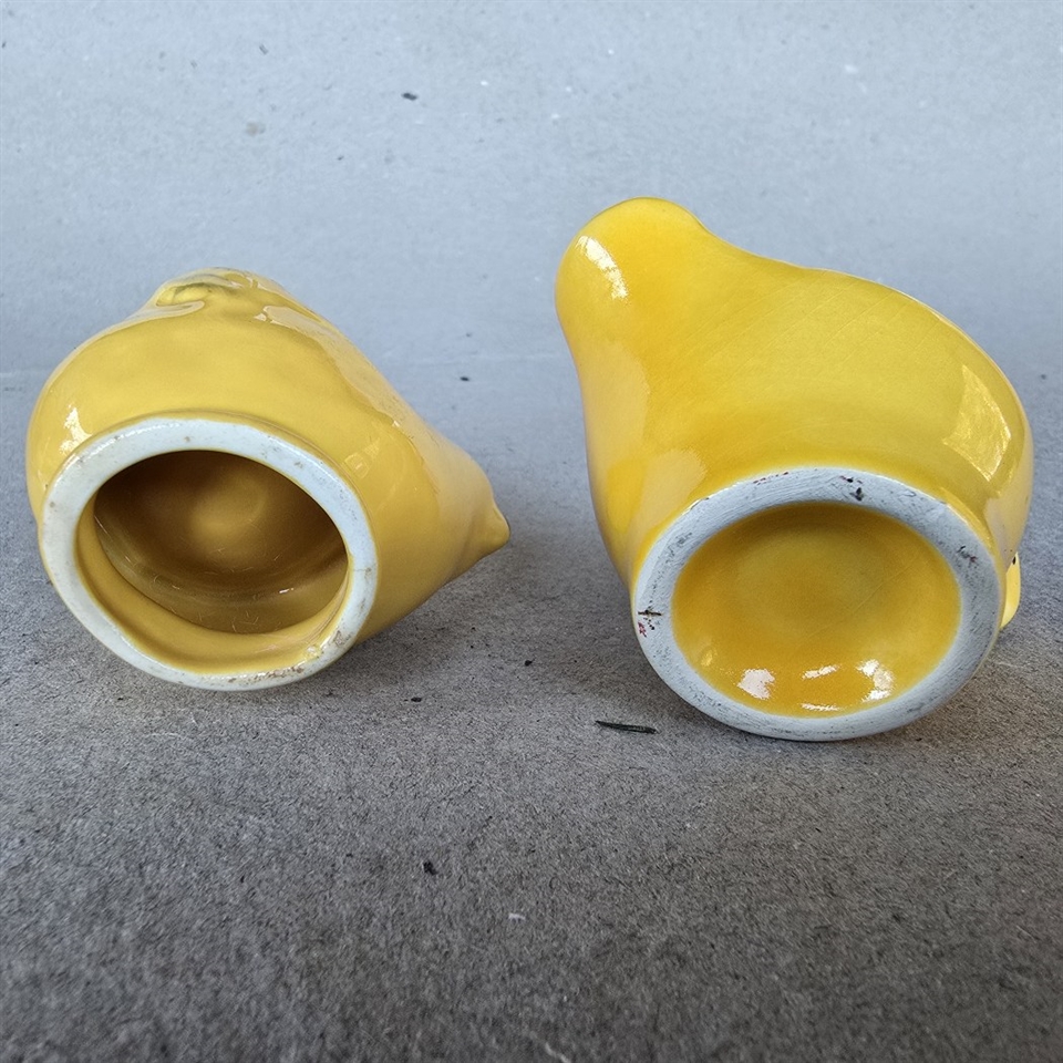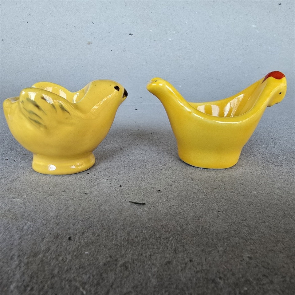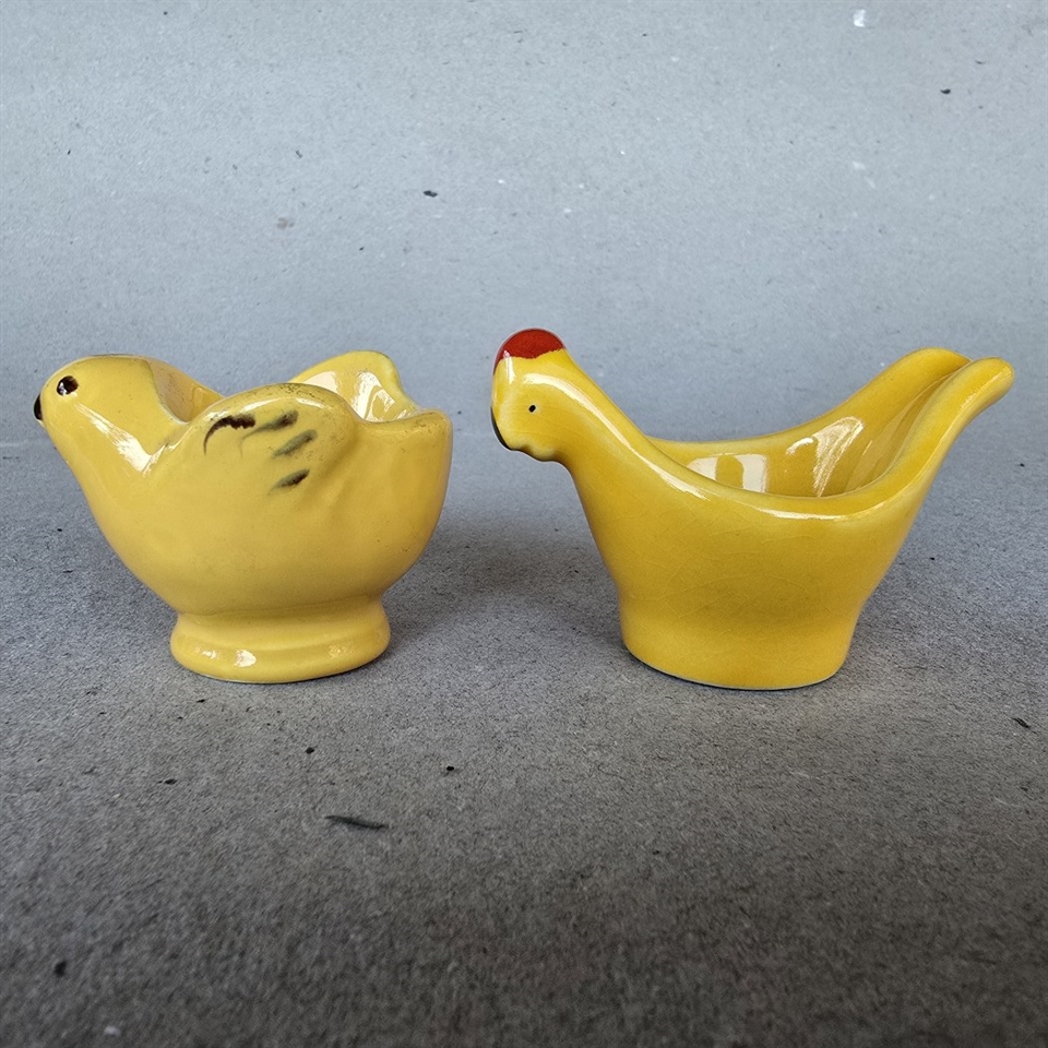 Opdag charmen ved fortiden med disse vintage æggebægre, der fremstiller en gul kylling og en gul høne, prydet med en iøjnefaldende rød kam.