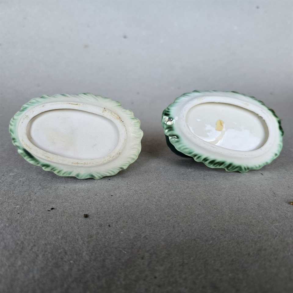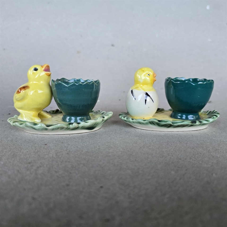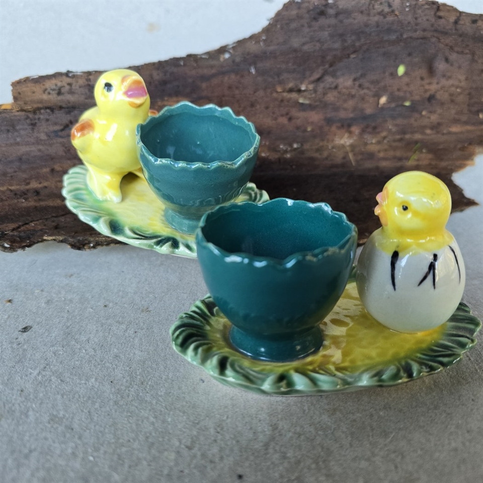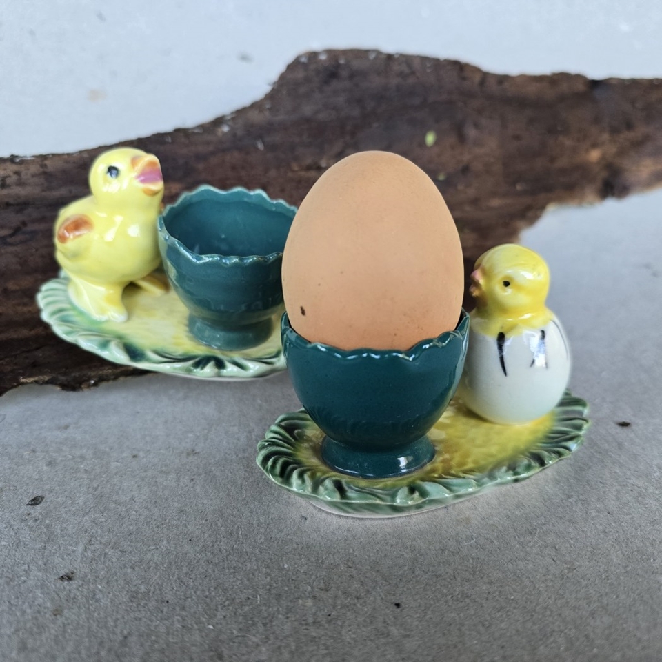 Opdag charmen ved vintage påskepynt med vores "Kyllinger i æg med æggebægre på oval underdel". Dette sæt består af to gamle porcelænsæggeholdere, der skiller sig ud med deres unikke design.