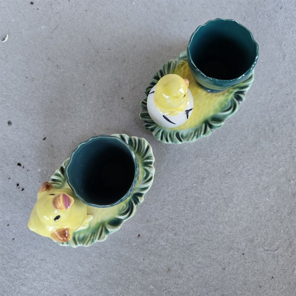 Hver æggebærer er prydet med en sød gul kylling placeret på en oval bund. Tilføjelse af grønne æggebægre tilfører et frisk pust af farve, hvilket gør dem perfekte til at lyse op dit påskebord.