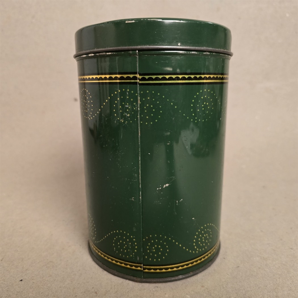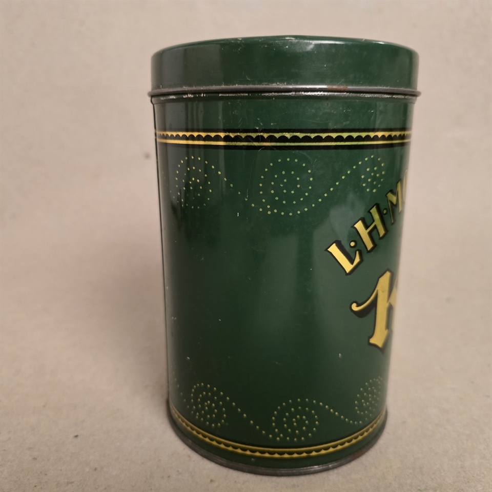 Giv dit køkken et strejf af charme og historie med denne bedårende 'L.H. Mortensen & Co, Vejle kaffe dåse' i mørkegrøn. Forestil dig en kaffedåse, ikke bare hvilken som helst dåse, men en der fortæller en historie med sit klassiske look og elegante guldtekst.