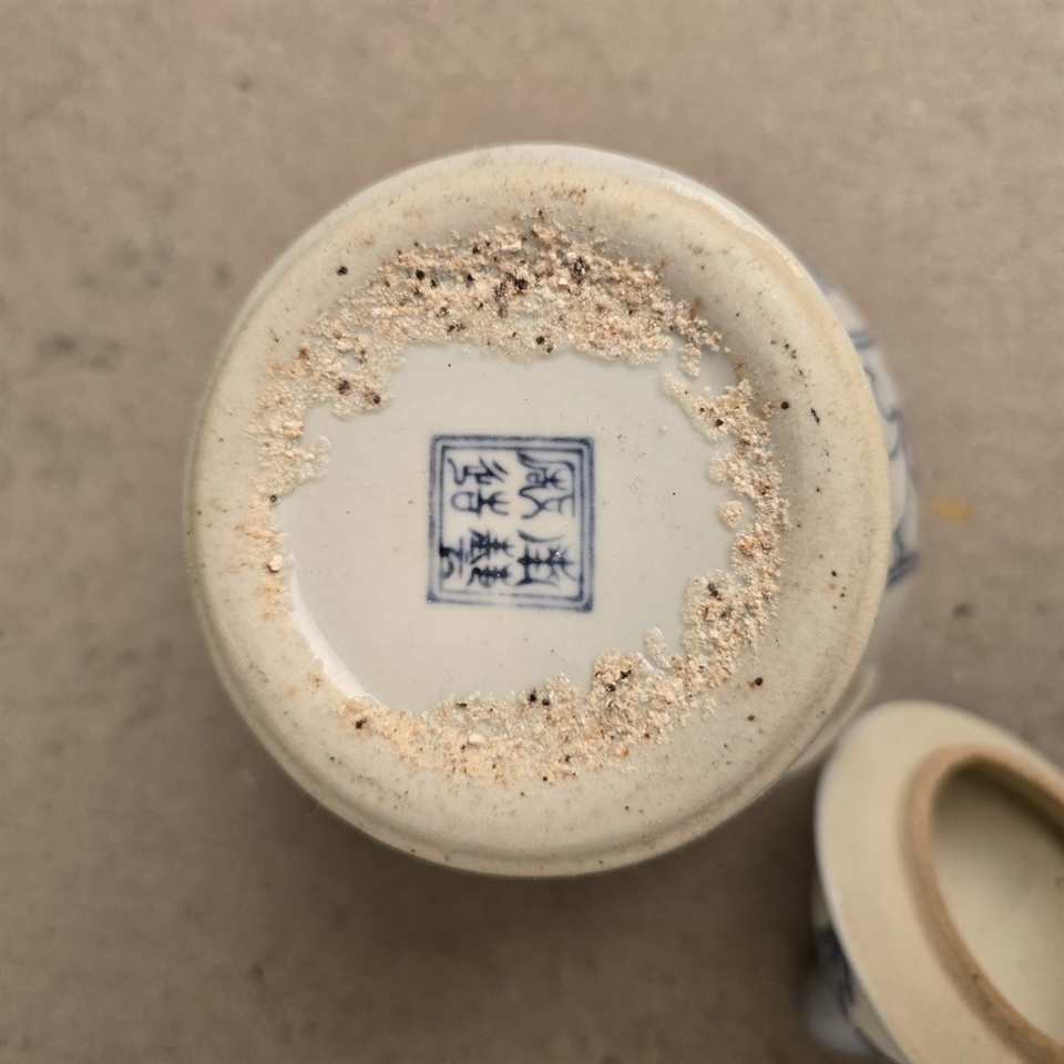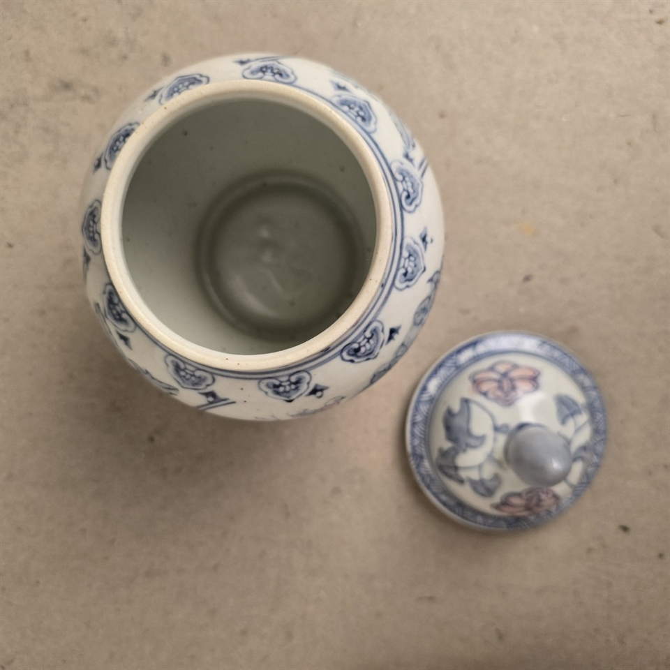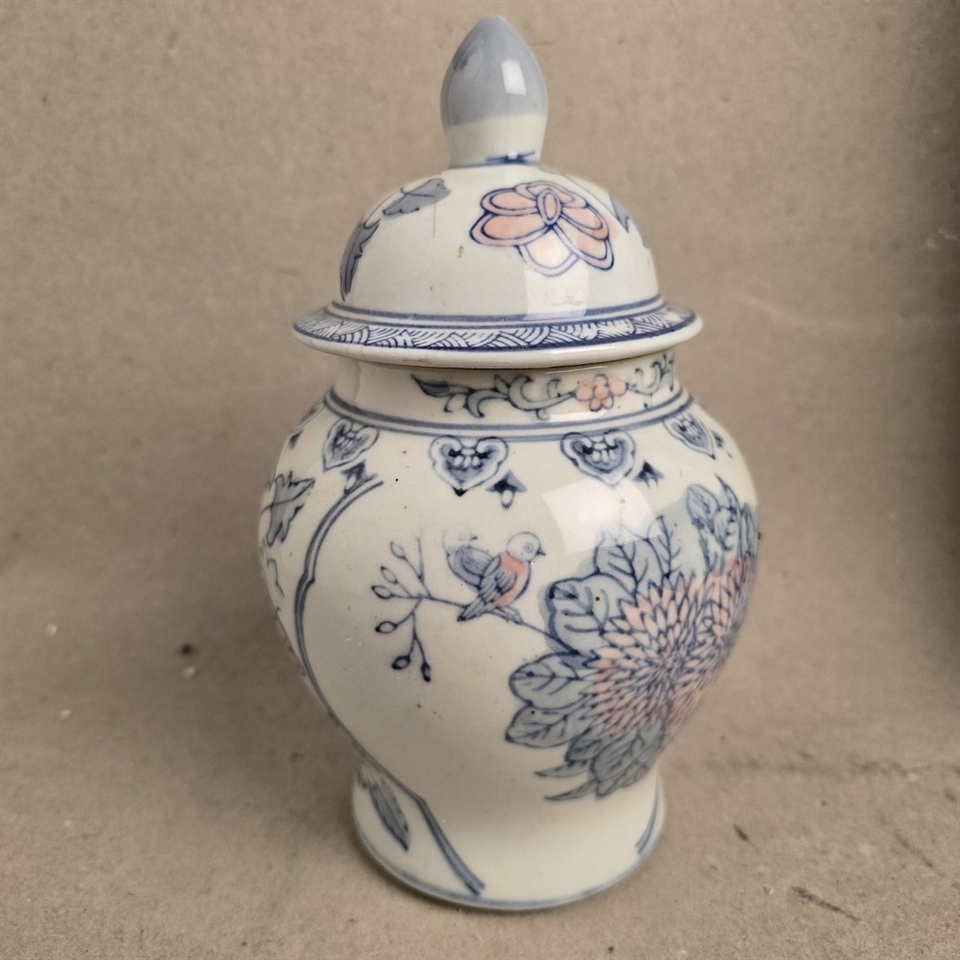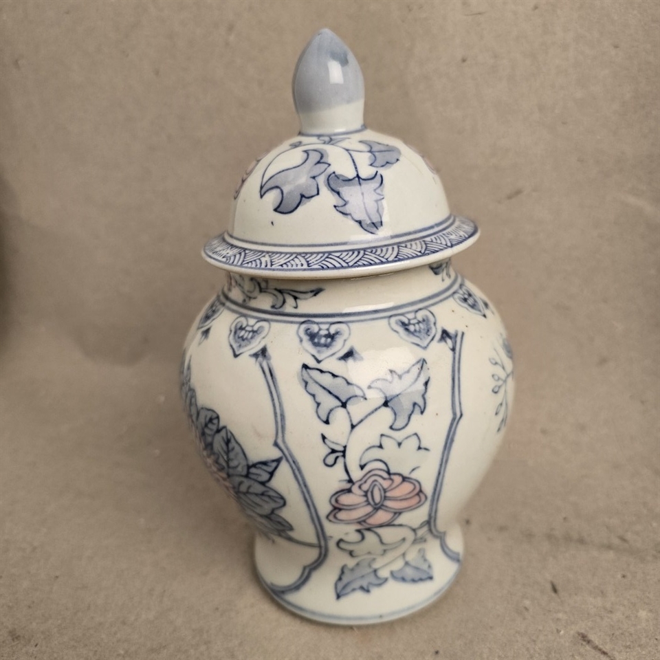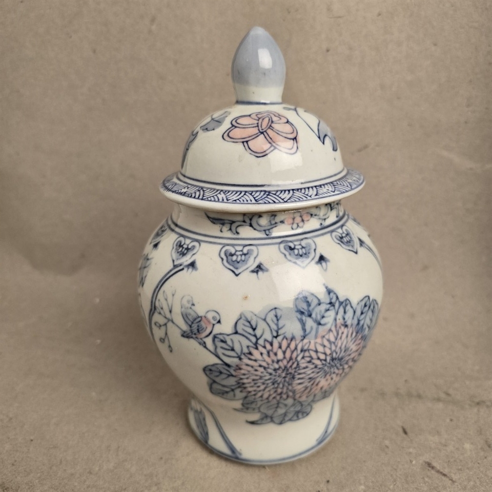 Opdag den udsøgte skønhed og tidløse elegance med vores "Låg krukke, porcelæn kinesisk dekoreret, ældre." Denne fortryllende krukke er en skat, der stråler af historie og raffinement. Fremstillet af det fineste porcelæn, prydes denne storslåede krukke af delikate lyseblå og rosa dekorationer, som smukt kontrasterer den rene, hvide baggrund, hvilket tilføjer et strejf af subtil farve og visuel interesse til ethvert rum.